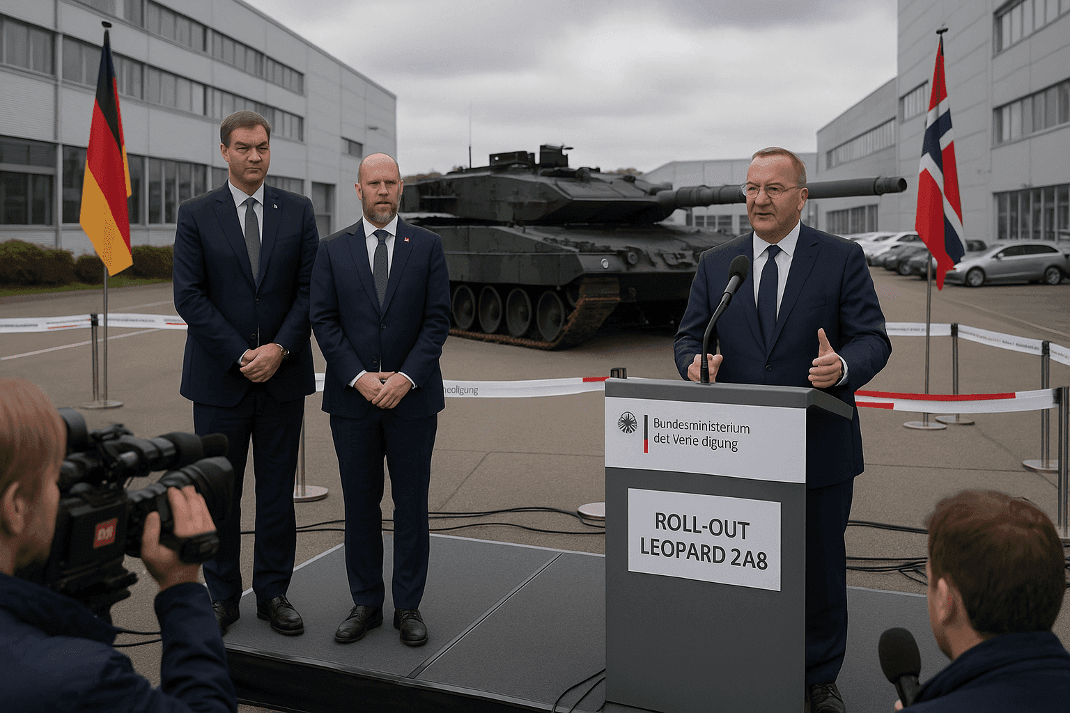 Bundesverteidigungsminister Pistorius, Norwegens Verteidigungsminister und Bayerns Ministerpräsident präsentieren gemeinsames RüstungsprojektBeim „Roll-out“ des Leopard 2A8 bei KNDS hielten Bundesverteidigungsminister Boris Pistorius, Norwegens Verteidigungsminister Tore O. Sandvik und Bayerns Ministerpräsident Markus Söder eine gemeinsame Veranstaltung ab, die die Bedeutung des neuen Panzermodells für die Sicherheitsarchitektur unterstreicht.