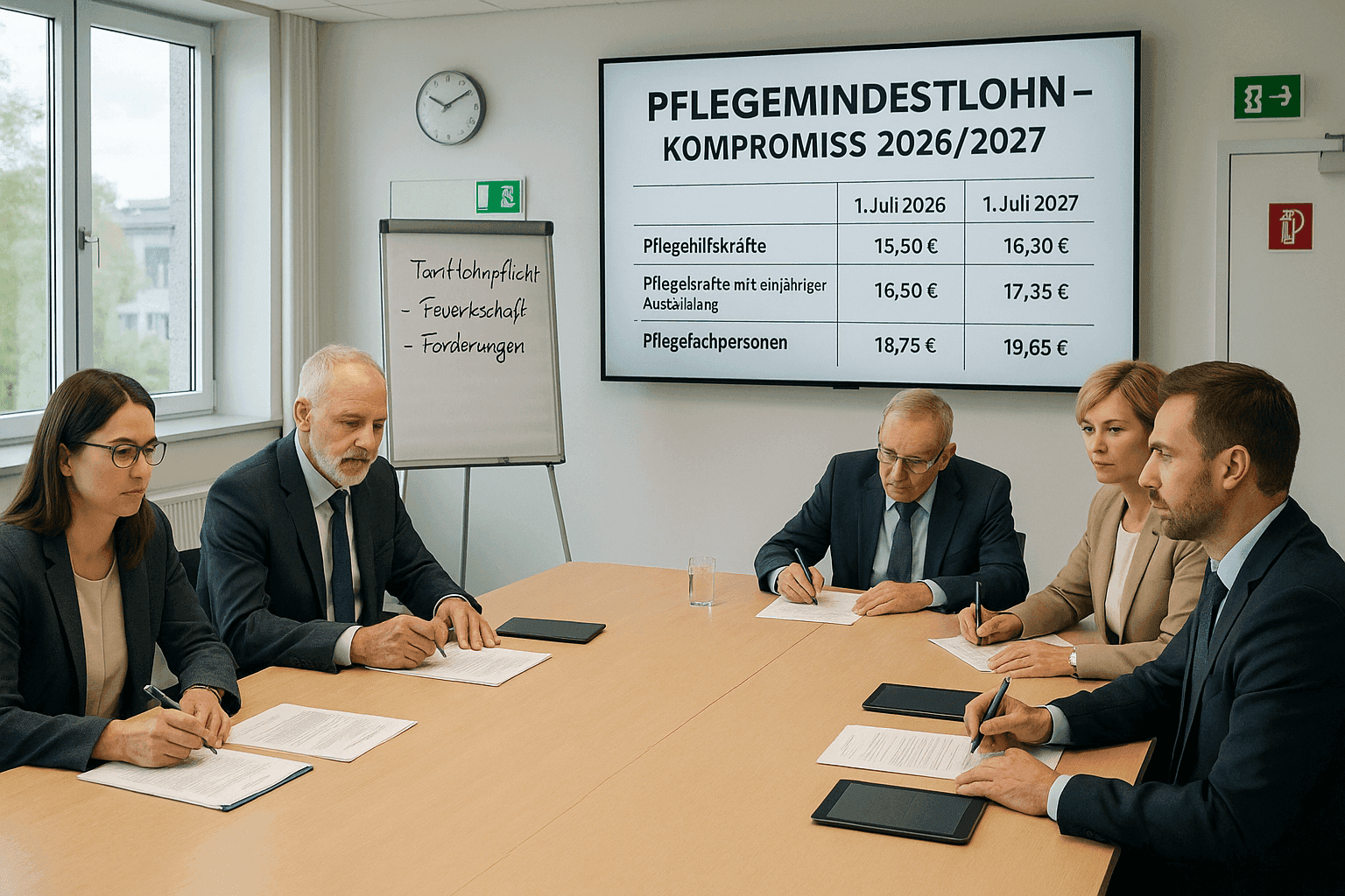 Die Pflegekommission hat eine zweistufige Erhöhung des Pflegemindestlohns beschlossen: Im Juli 2026 und Juli 2027 steigt der Mindestlohn jeweils um 2,6 Prozent. Die Anpassungen betreffen alle Pflegekräfte in stationären und ambulanten Einrichtungen, ausgenommen Krankenhäuser.