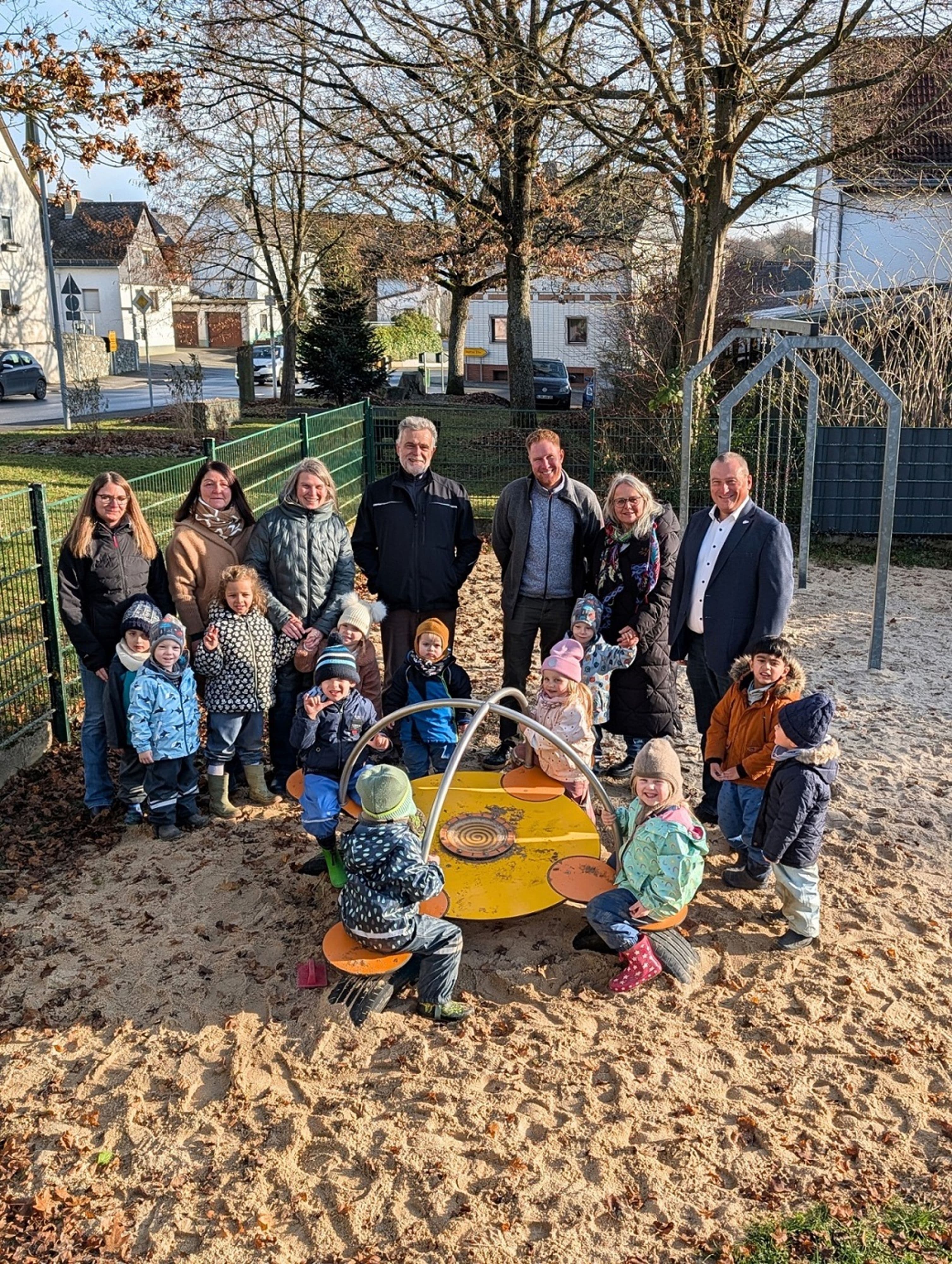Die Kita "Speckmäuse" in Altenkirchen freut sich über ein neues Schaukelgerüst und eine Kugelwippe. Das Schaukelgerüst wurde nachhaltig vom Kurpark-Spielplatz umgesetzt, während die Kugelwippe mit 2.970 Euro von der Stadt Braunfels neu angeschafft wurde.
