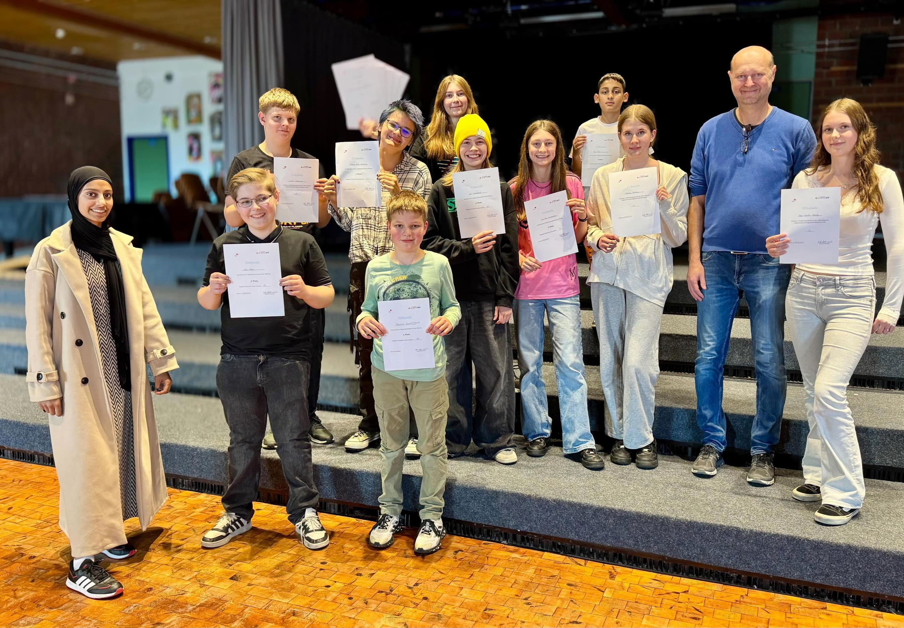 Schulinterner Wettbewerb fördert Mathefreude und Ehrgeiz bei allen JahrgangsstufenAn der Gesamtschule Wulfen fand zum zweiten Mal der schulinterne Kopfrechenwettbewerb statt, an dem Schülerinnen und Schüler aller Jahrgangsstufen teilnahmen. Die Wettbewerbe in den Altersgruppen 5/6 und 7–9 förderten neben dem Ermitteln der besten Kopfrechner auch die Freude an Mathematik und der Kopfrechen-AG. Die Erstplatzierten waren Haylee Wilmering und Hendrik Sondermann, gefolgt von Teo Heydebreck und Karl Kurz sowie Leni Komorowski und Ibrahim. Schulleiter Hermann Twittenhoff lobte die Begeisterung der Teilnehmenden, und die Schule plant, den Wettbewerb auch im nächsten Jahr fortzusetzen.
