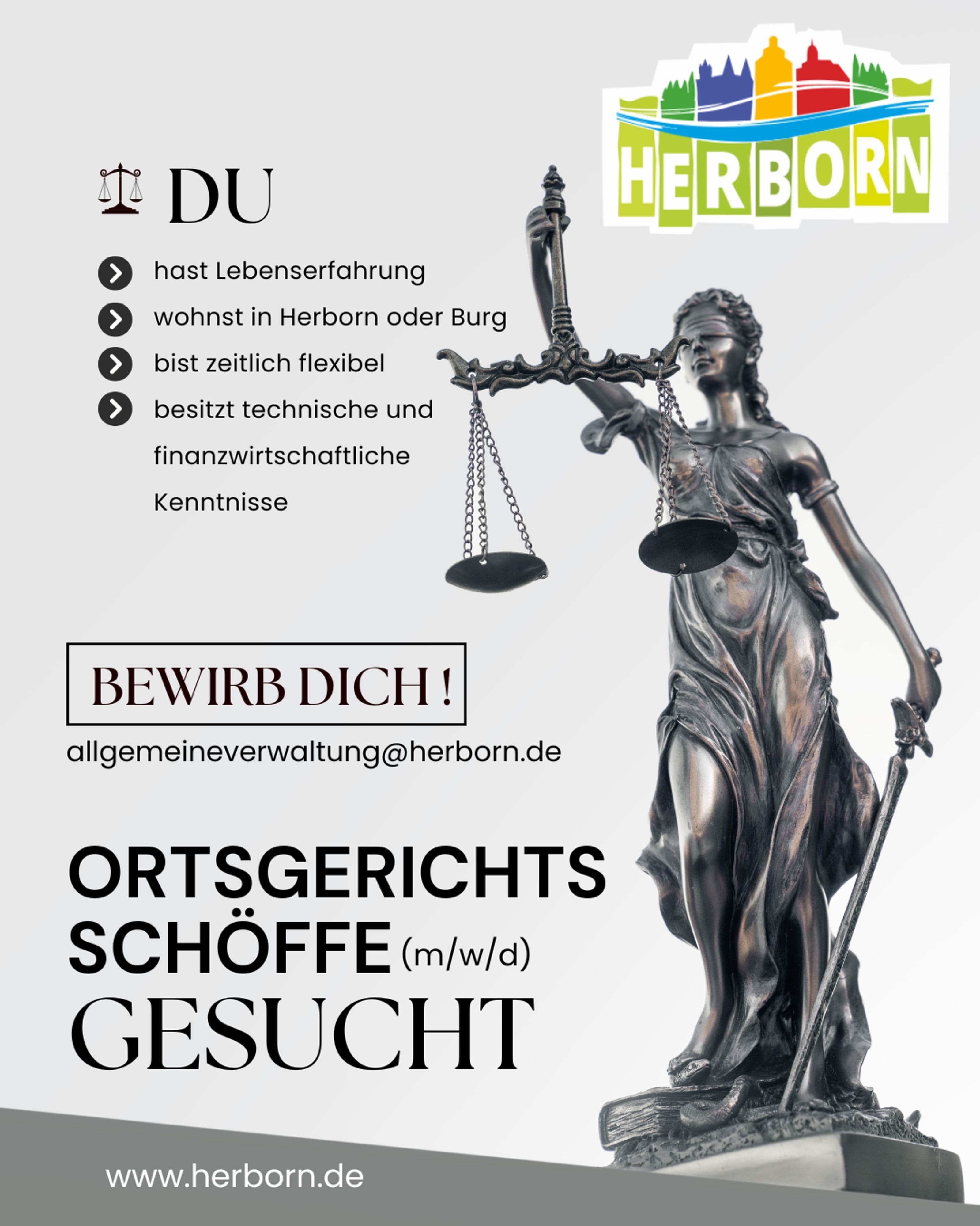 Ehrenamtliche für Beglaubigungen und Nachlasssicherung im Ortsteil Burg gesucht – Bewerbung bis 14. NovemberDie Stadt Herborn sucht eine engagierte Persönlichkeit als Ortsgerichtsschöffe (m/w/d) für das Ortsgericht Herborn I. Das Ehrenamt umfasst Aufgaben wie die Beglaubigung von Unterschriften, Nachlasssicherung und Immobilienbewertung. Bewerbungen von Einwohnern des Ortsteils Burg mit Lebenserfahrung und Vertrauen in der Bevölkerung sind bis 14. November per E-Mail möglich. Die Ernennung erfolgt für zehn Jahre durch den Amtsgerichtsdirektor.