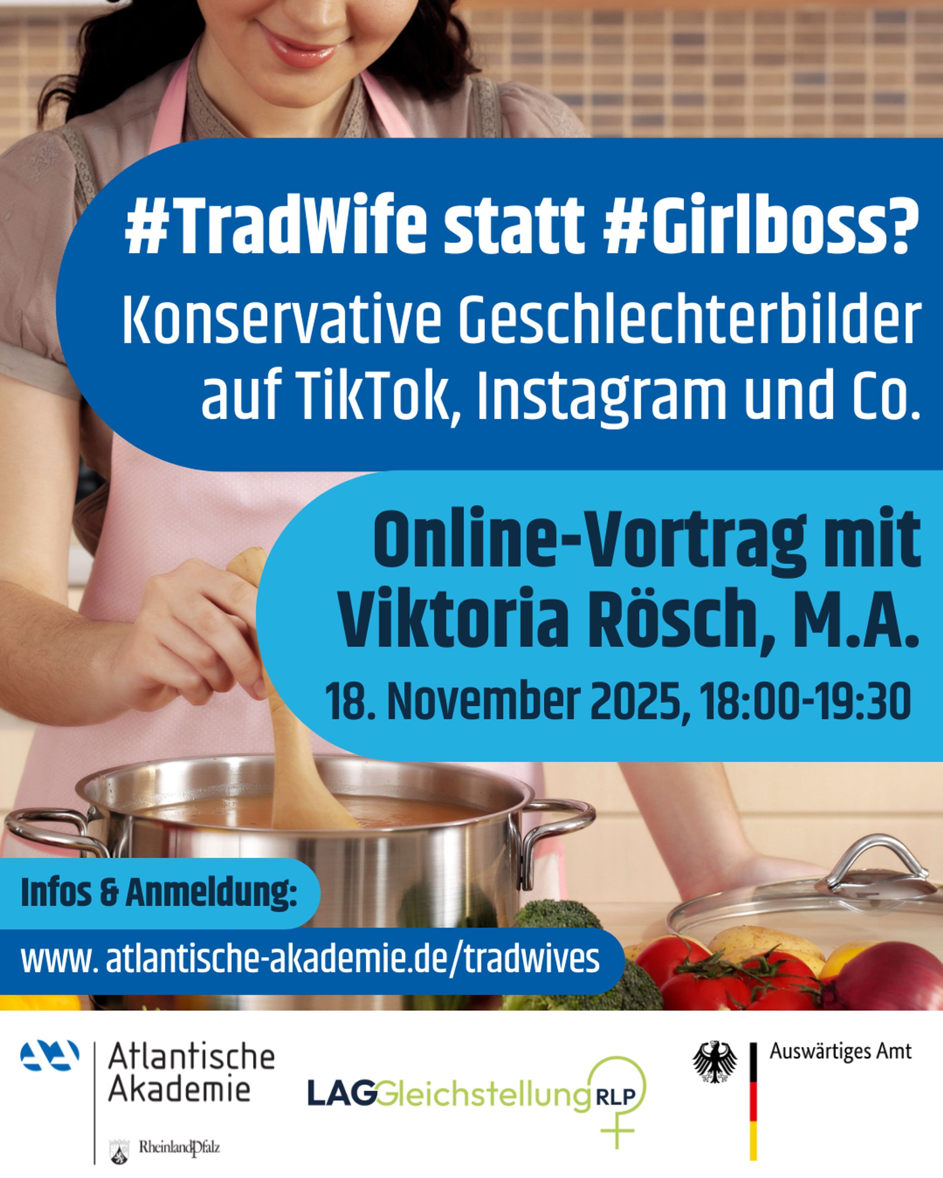 Die Atlantische Akademie Rheinland-Pfalz e.V. lädt am 5. November 2025 um 18 Uhr zu einem kostenlosen Online-Vortrag ein, der Social Media-Trends wie #TradWives und ihre Wirkung auf Rollenbilder analysiert. Soziologin Viktoria Rösch beleuchtet dabei insbesondere die Inszenierung traditioneller Geschlechterrollen auf Plattformen wie TikTok und Instagram. Die Veranstaltung richtet sich an Fachpublikum und interessierte Öffentlichkeit; eine Anmeldung über die Akademie-Website ist erforderlich.