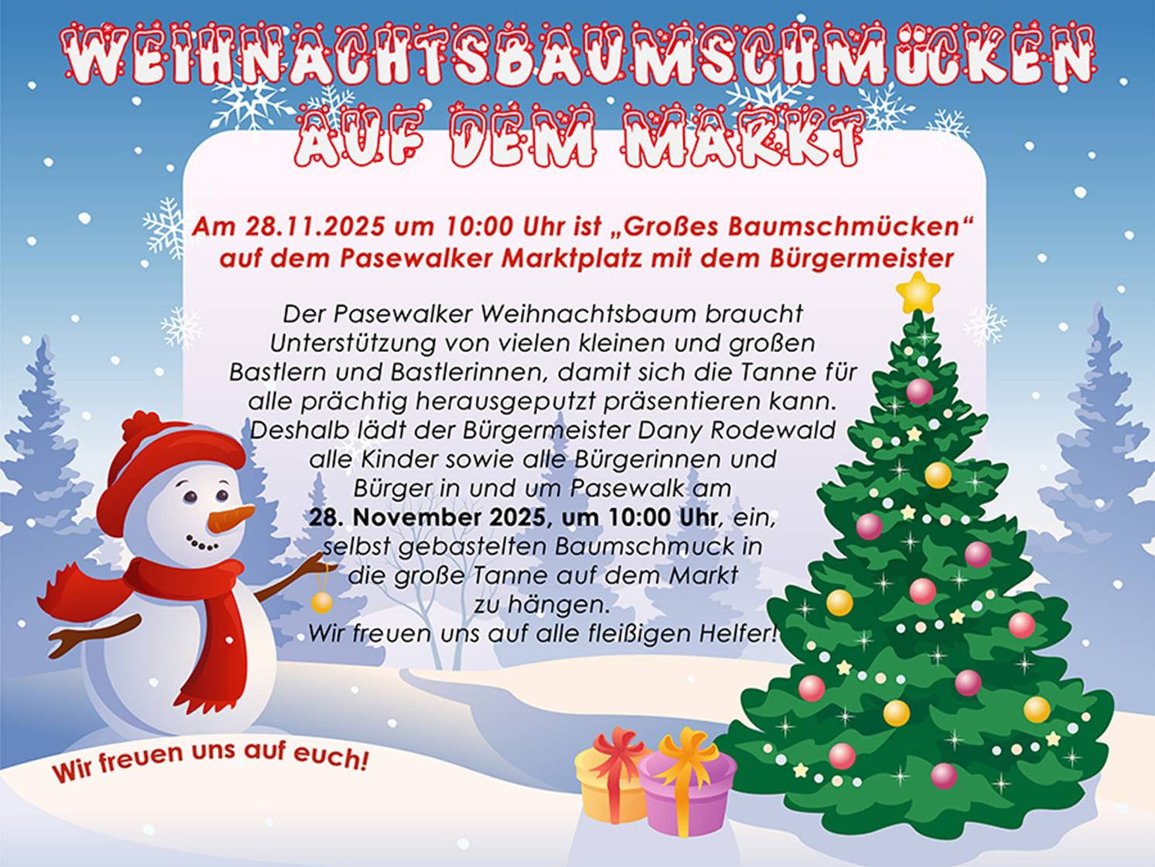 Benefizkonzert, Lichterfest und Weihnachtsmarkt stimmen auf die Adventszeit einEnde November lädt Pasewalk zu vielfältigen Veranstaltungen ein, die Musik, Lichterzauber und Gemeinschaft vereinen. Am 21. November spielen das Bundespolizeiorchester Berlin beim Benefizkonzert und die Innenstadt erstrahlt bei der Nacht der tausend Lichter. Am 22. November sorgt die Herbstgala im Historischen U für Unterhaltung, bevor am 28. November Bürgermeister Danny Rodewald gemeinsam mit Bürgern den Marktplatz weihnachtlich schmückt.