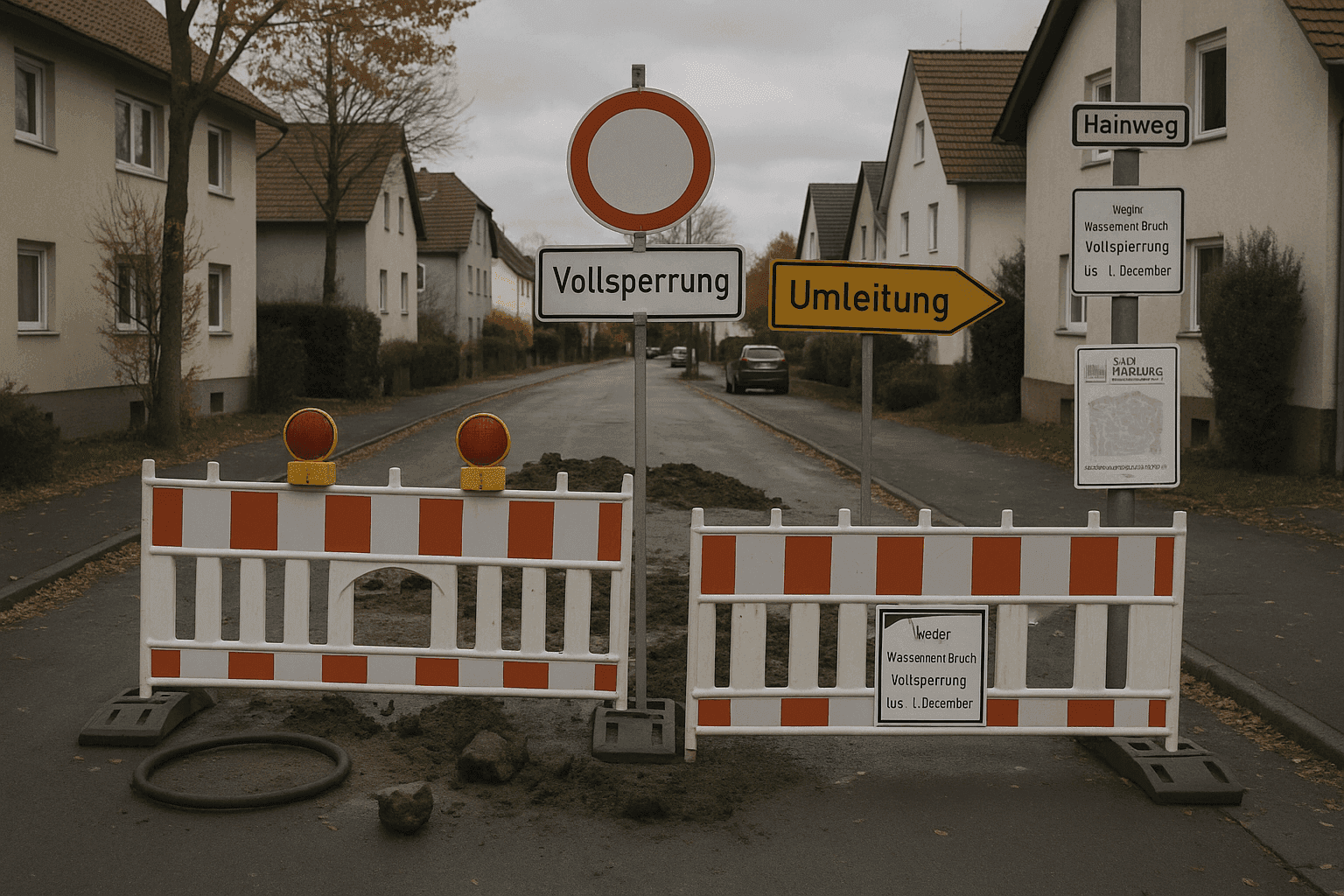 Wasserrohrbruch und Gasleitungsarbeiten verzögern Öffnung bis 1. Dezember – Umleitungen empfohlenVerlängerte Vollsperrung am Hainweg in Marburg