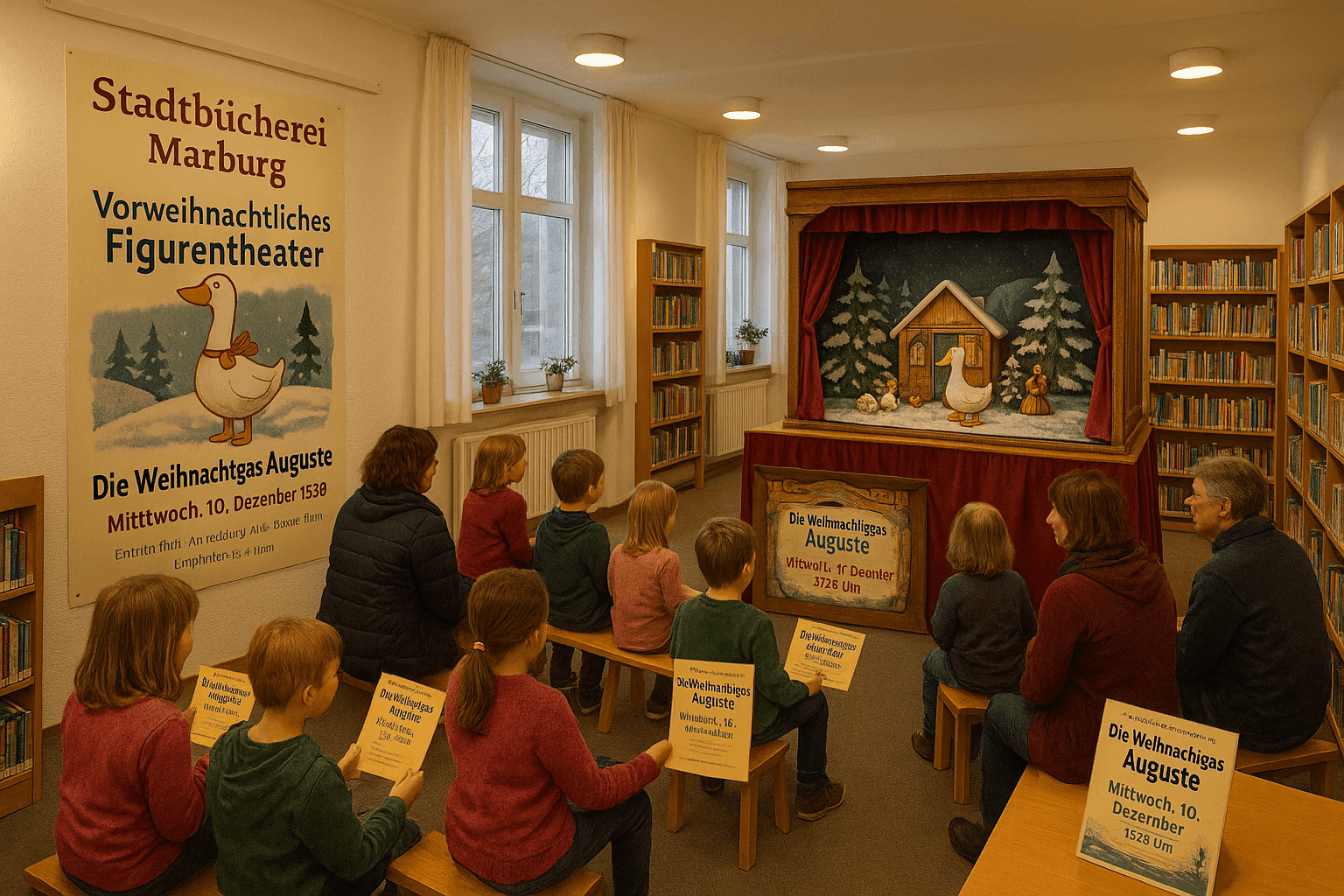 Kostenloses Figurentheater in der Stadtbücherei am 10. Dezember – ein Erlebnis für Kinder ab vier JahrenAm Mittwoch, den 10. Dezember, zeigt das Figurentheater Eigentlich in der Stadtbücherei Marburg um 15:30 Uhr das kostenlose Stück „Die Weihnachtsgans Auguste“ – empfohlen für Kinder ab vier Jahren, Anmeldung nicht erforderlich. Die Geschichte erzählt von der engen Freundschaft zwischen dem Jungen Peter und der Weihnachtsgans Auguste, die die Familie vor eine emotionale Herausforderung stellt. Das Stück fördert mit lebendigen Figuren Werte wie Freundschaft und Mitgefühl und lädt Familien dazu ein, gemeinsam in vorweihnachtliche Stimmung zu kommen.