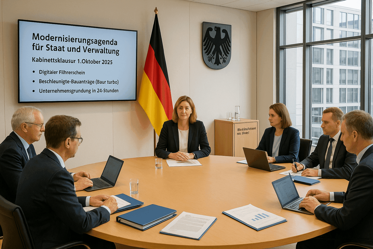 Modernisierungsagenda 2025: Schnellerer Führerschein, Bauverfahren und Unternehmensgründung in nur 24 StundenDie Bundesregierung hat am 1. Oktober 2025 eine Modernisierungsagenda beschlossen, um Verwaltung effizienter und digitaler zu gestalten. Wichtige Projekte sind der digitale Führerschein, beschleunigte Bauverfahren und die Unternehmensgründung in 24 Stunden. Die enge Zusammenarbeit von Bund, Ländern und Kommunen ist dabei entscheidend. Ziel ist eine bürgernahe Verwaltung mit weniger Bürokratie und besserem Service.