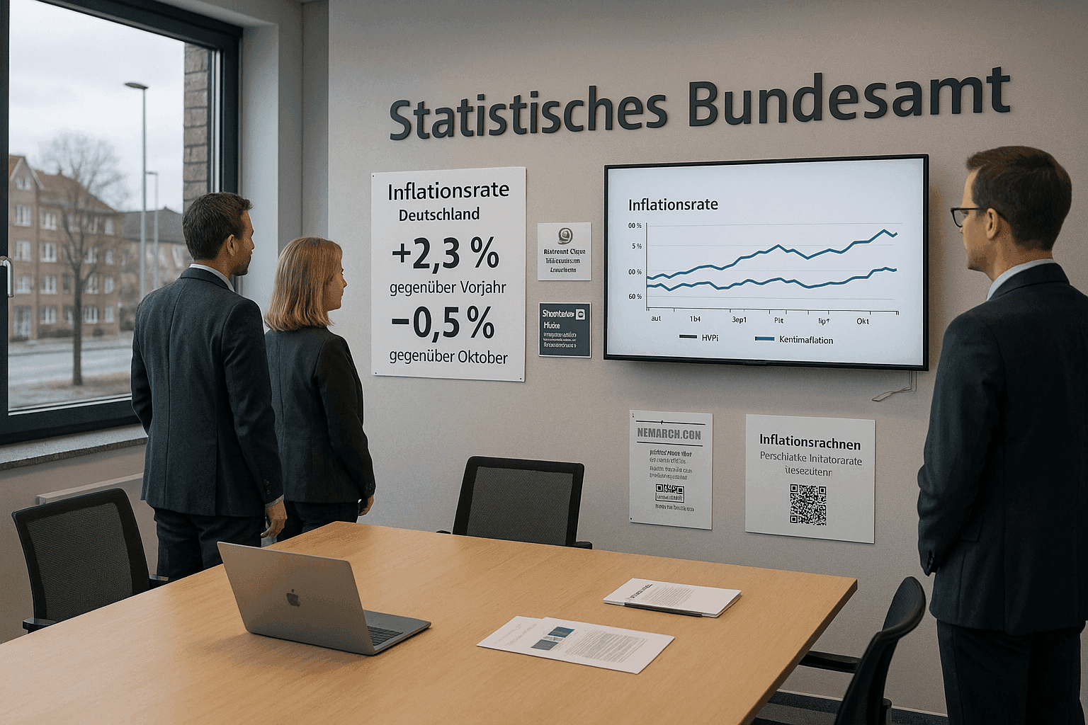 Statistisches Bundesamt meldet 2,3 % Jahresinflation – Endgültige Zahlen am 12. DezemberDas Statistische Bundesamt schätzt die Inflationsrate für November 2025 auf +2,3 % im Jahresvergleich, während die Preise im Vergleich zum Oktober 2025 um 0,5 % gesunken sind. Der harmonisierte Verbraucherpreisindex (HVPI) liegt im Jahresvergleich bei +2,6 %, die Kerninflation bei +2,7 %. Für eine individuelle Berechnung der Inflationsrate steht ein Online-Inflationsrechner zur Verfügung. Die endgültigen Zahlen zum Verbraucherpreisindex veröffentlicht das Amt am 12. Dezember 2025.
