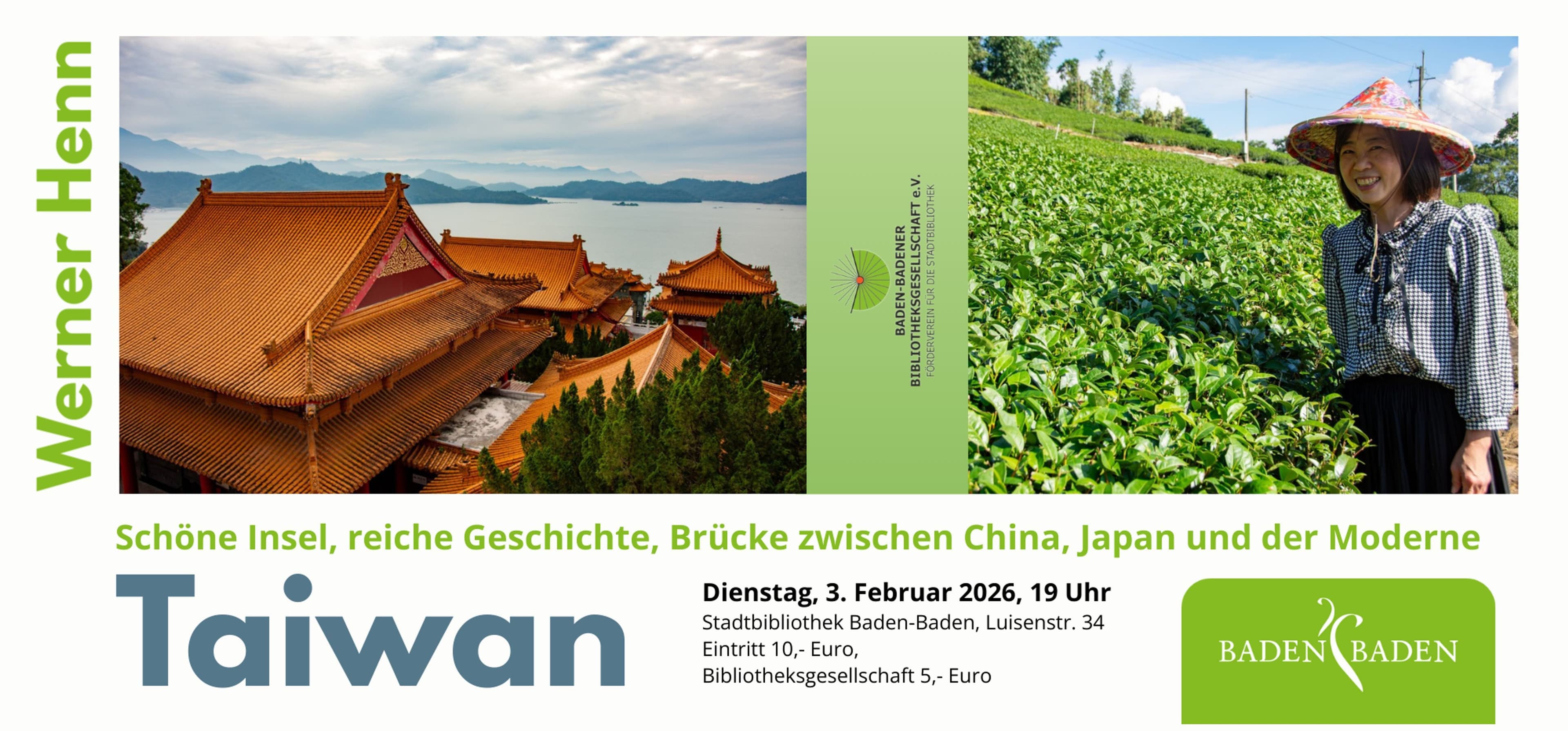 Fotograf Werner Henn zeigt am 3. Februar in der Stadtbibliothek Baden beeindruckende Einblicke in Kultur, Natur und Demokratie der InselAm Dienstag, den 3. Februar um 19 Uhr lädt die Stadtbibliothek Baden zu einem Bildervortrag über Taiwan ein, präsentiert vom Fotografen und Reisenden Werner Henn. Die Insel verbindet Tradition und Moderne mit eindrucksvollen Landschaften und einer fortschrittlichen Demokratie. Henn, ehemaliger Arte-Redakteur und Gemeinderat, garantiert einen informativen Abend. Karten sind für 10 Euro (5 Euro für Mitglieder) in der Stadtbibliothek erhältlich.