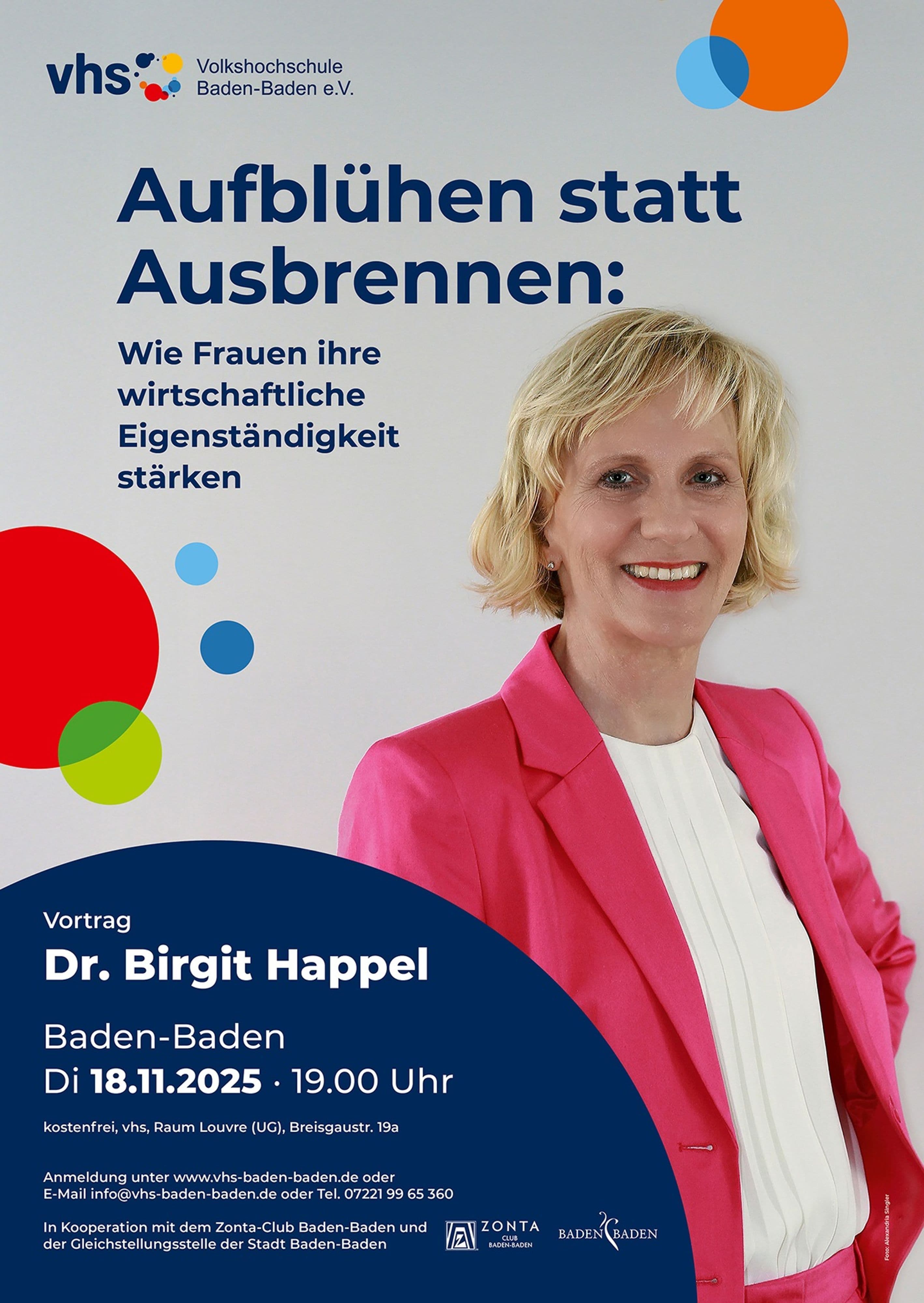 Am Dienstag, 18. November, um 18 Uhr lädt die Volkshochschule Baden zu einem kostenfreien Vortrag mit Dr. Birgit Happel ein. Unter dem Motto „Aufblühen statt Ausbrennen“ werden systemische Hürden und praktische Strategien behandelt, wie Frauen ihre finanzielle Zukunft selbstbestimmt gestalten können. Die Veranstaltung findet in der Breisgaustraße 19a statt; eine Anmeldung ist telefonisch, per E-Mail oder online unter www.vhs-baden.de erforderlich.