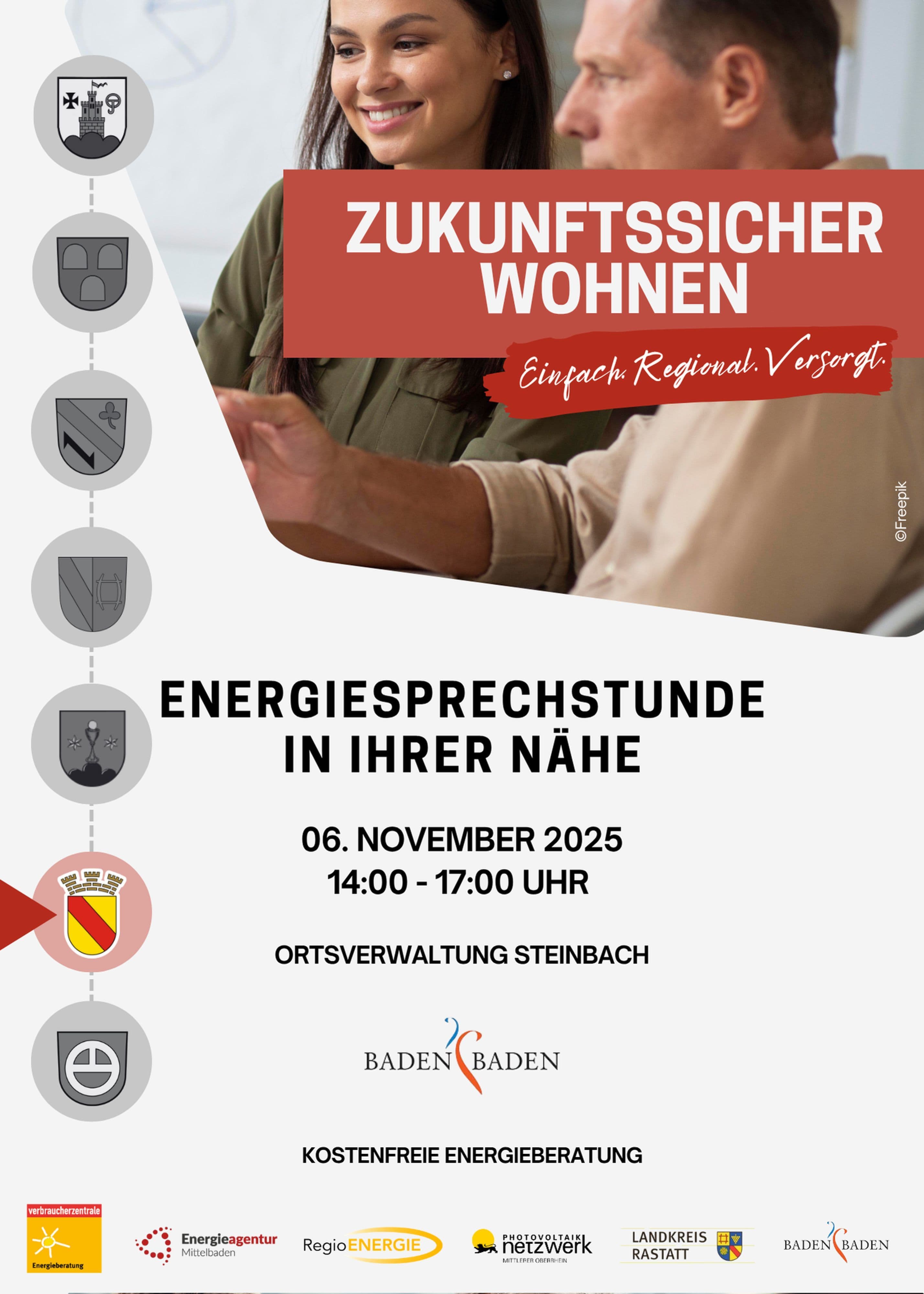 Individuelle Gespräche zu Effizienz, Heizung und Photovoltaik am 6. November – Anmeldung erforderlichAm 6. November 2025 lädt die Ortsverwaltung Rebland gemeinsam mit der Energieagentur Mittelbaden und der Verbraucherzentrale zu kostenlosen, individuellen Energieberatungen im Ratssaal der Verwaltungsstelle Steinbach ein. Von 14 bis 17 Uhr erhalten Interessierte in 45-minütigen Gesprächen praxisnahe Antworten zu Energieeffizienz, Heizungsmodernisierung und Photovoltaik. Die Teilnahme ist kostenfrei, jedoch nur nach vorheriger Anmeldung per Online-Formular oder Telefon möglich. Weitere Informationen und Angebote finden Sie auf der Kampagnenwebsite.