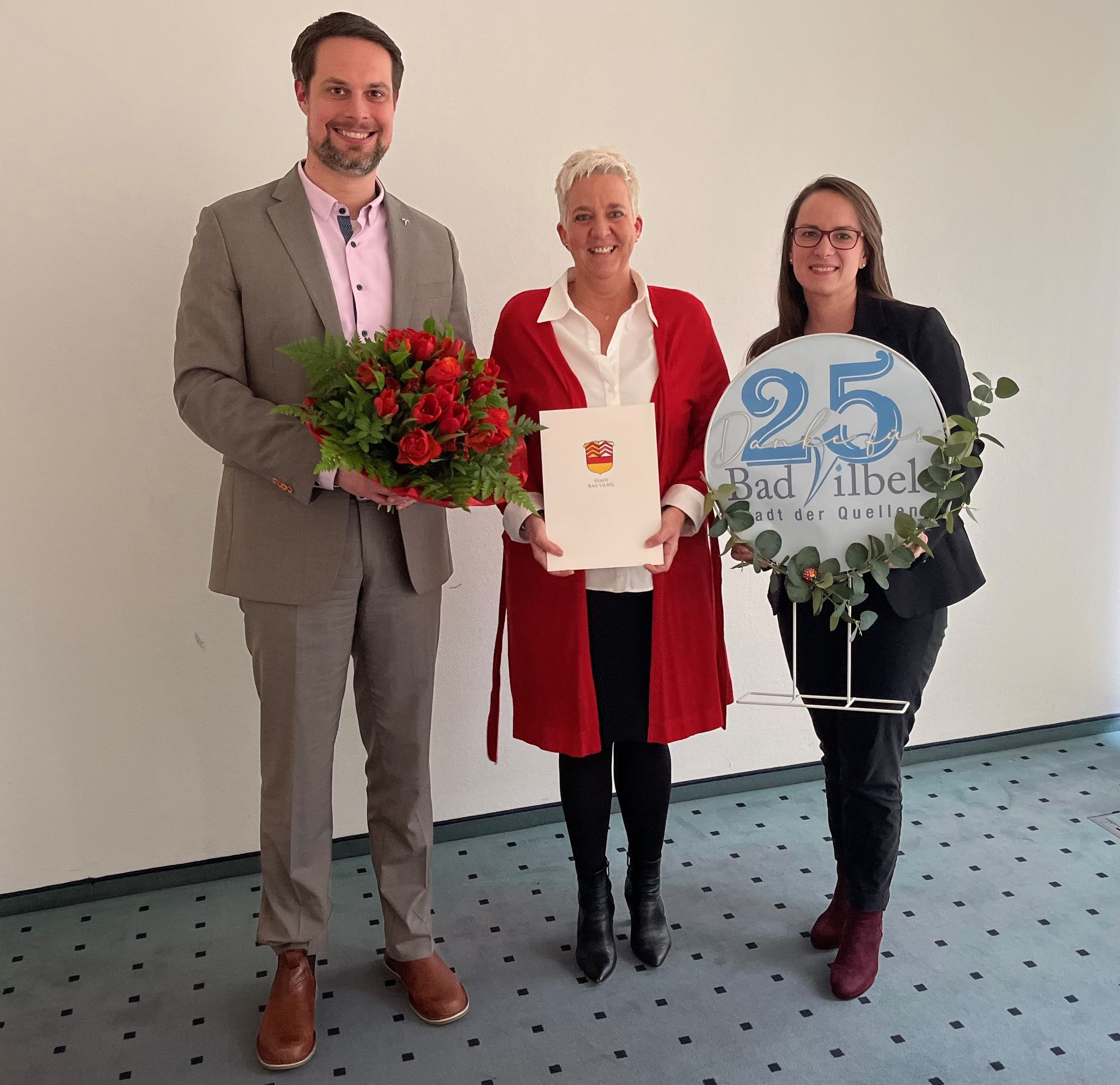 Carolin Hartmann feiert ihr 25-jähriges Jubiläum bei der Stadtverwaltung Bad Vilbel. Seit ihrem Start 2000 hat sie maßgeblich die Bereiche Soziale Sicherung und seit Oktober die Personalverwaltung mitgestaltet. Ihre verlässliche und engagierte Arbeitsweise wird von der Stadtführung besonders anerkannt.