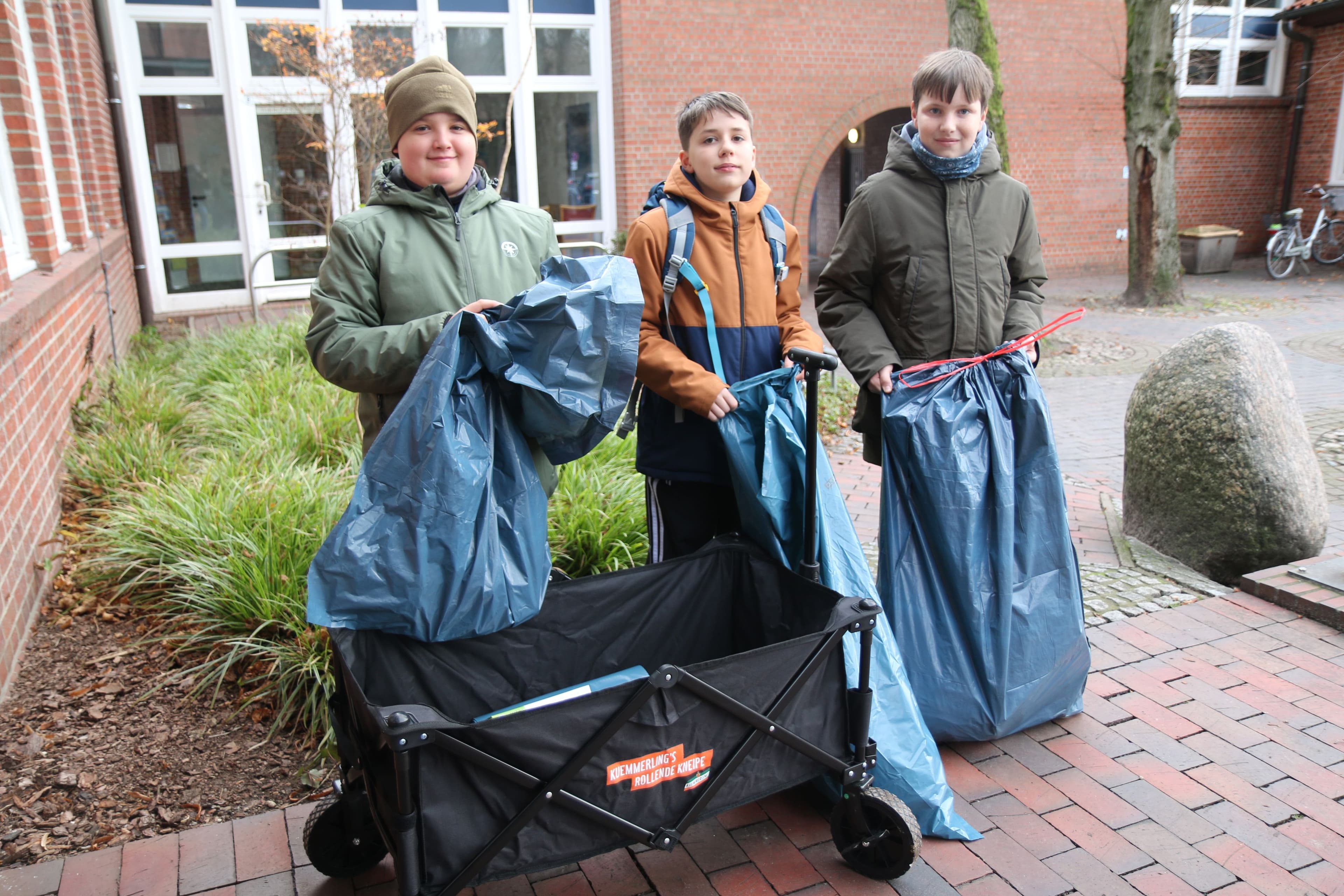 Drei Schüler der IGS Buchholz sammelten am vergangenen Mittwoch im Bereich Rathauspark und Fußgängerzone fast eineinhalb Müllsäcke mit Abfällen wie Zigarettenstummeln und Glasscherben ein. Ausgerüstet mit Greifern, Mülltüten und Bollerwagen engagierten sich Ben-Luca, Stephan und Hannes zwei Stunden lang für eine saubere Innenstadt. Mit ihrer Aktion wollen sie auf das Müllproblem aufmerksam machen und andere zu mehr Verantwortung für die Umwelt motivieren.