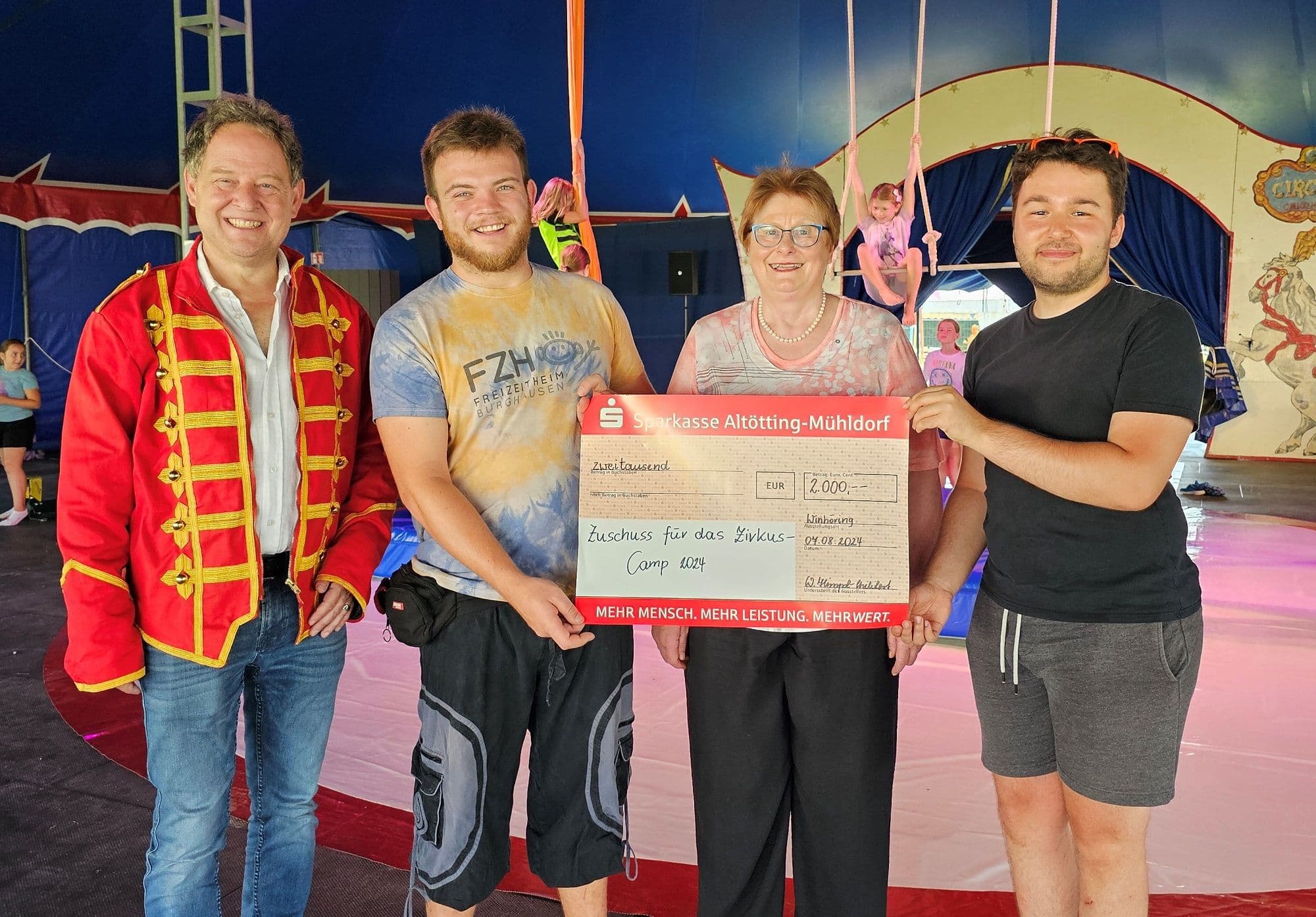 Waltraud Himpsl-Philibert, die Vorsitzende von ProPräventiv Altötting e. V., überreichte persönlich einen Scheck über 2.000 Euro und betonte die Bedeutung der Arbeit, die im Rahmen des Zirkuscamps geleistet wird. Dr. Peter von Zumbusch, Werksleiter der Wacker Chemie AG in Burghausen, brachte zusätzlich 1.500 Euro mit und nahm begeistert an den Zirkusaktivitäten teil.