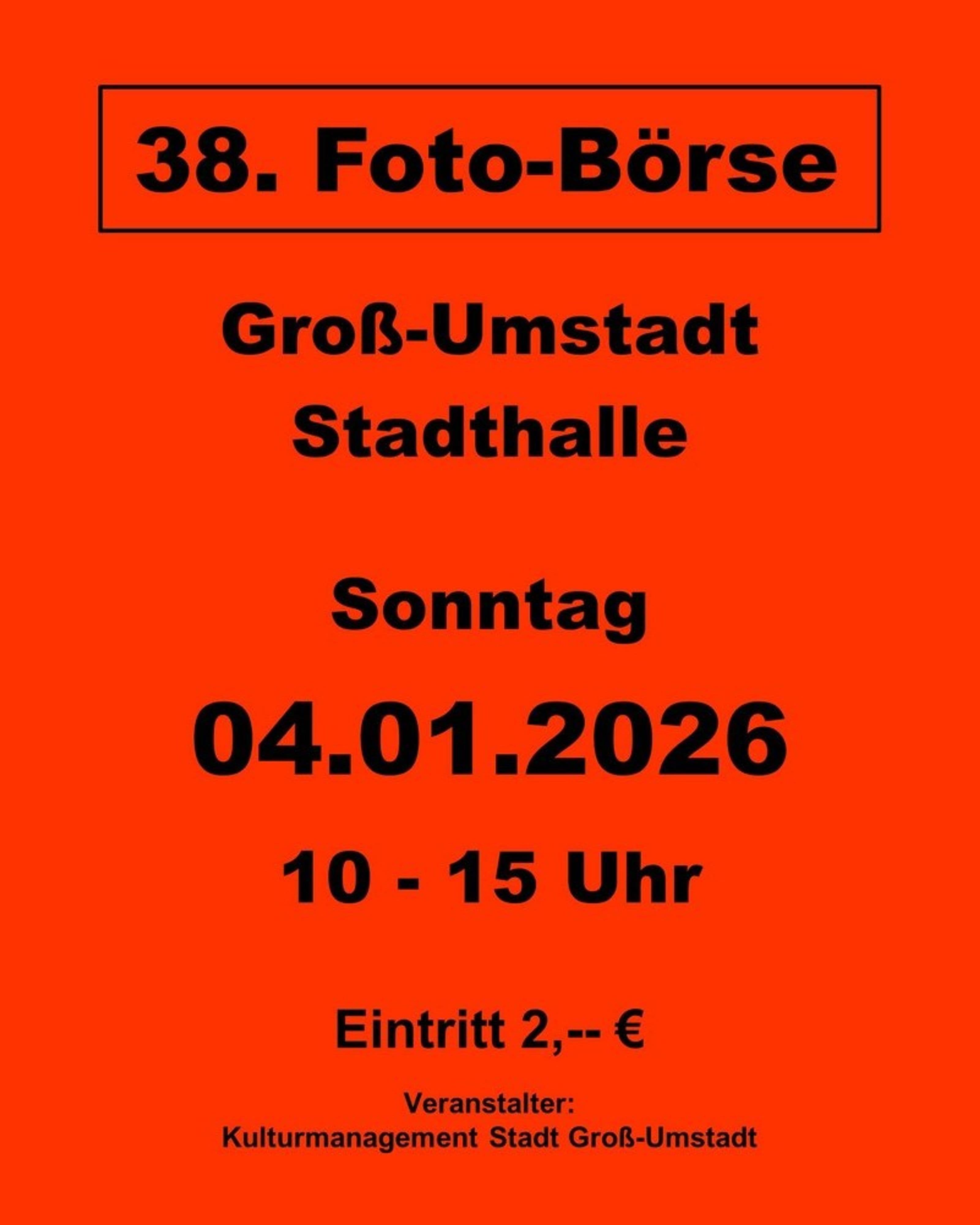 Am 4. Januar Technik kaufen, verkaufen und Fotoschau im Rathaus erlebenAm Sonntag, 4. Januar 2026, lädt die Stadt Groß-Umstadt von 10 bis 15 Uhr zur 38. Fotobörse in der Stadthalle ein. Neben dem Kauf und Verkauf von neuer und gebrauchter Fototechnik bietet die Veranstaltung eine Fotoschau des Fotoclubs im Rathaus. Der Eintritt beträgt 2 Euro, und Fotobegeisterte können hier Technik entdecken, tauschen und sich inspirieren lassen.