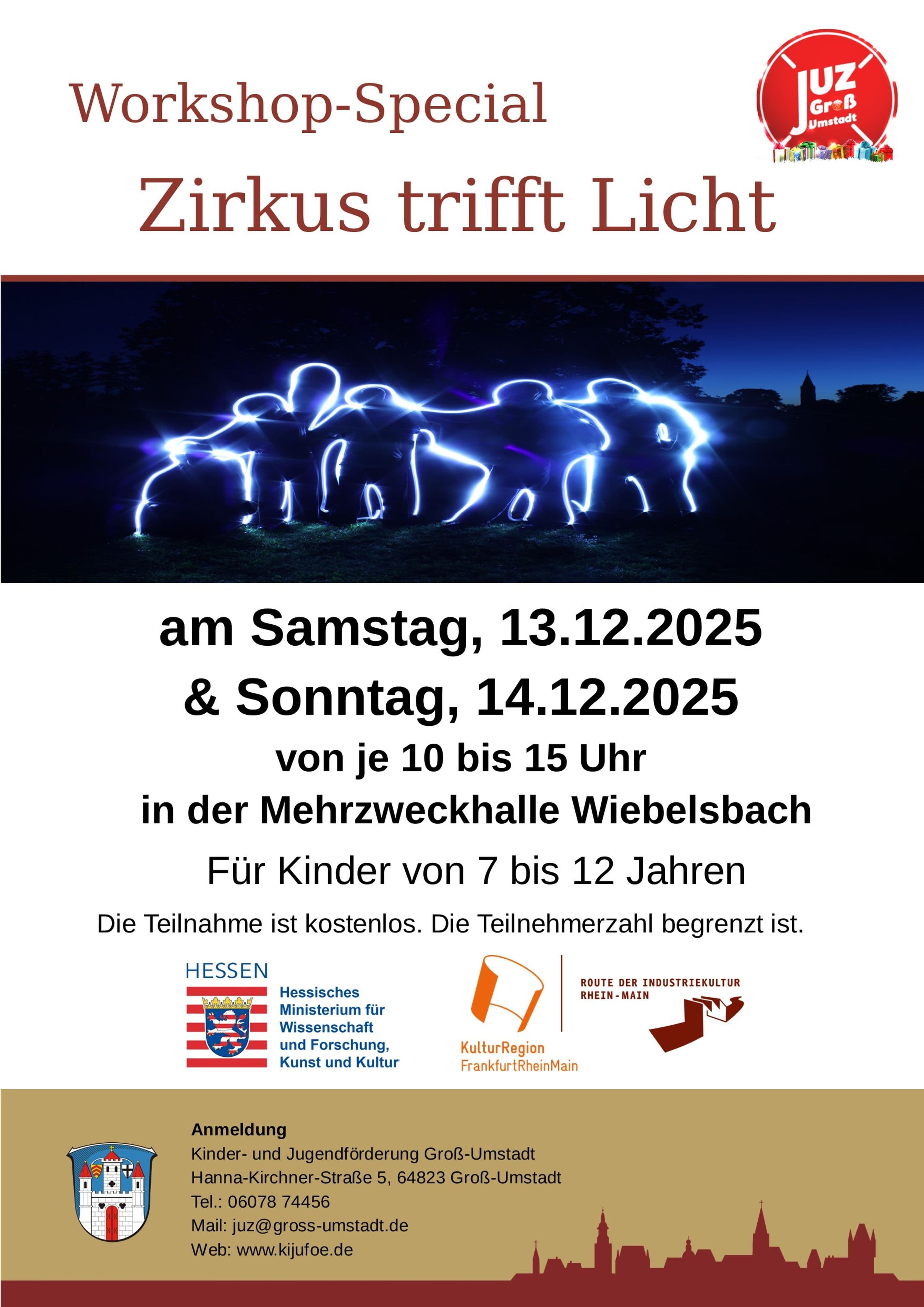 Groß-Umstadt lädt am 13. und 14. Dezember zu kostenlosen Workshops mit LED-Technik und Langzeitbelichtung einAm 13. und 14. Dezember 2025 lädt die Stadt Groß-Umstadt junge Menschen zu einem kostenlosen „Zirkus“-Event in der Mehrzweckhalle Wiebelsbach ein, das Akrobatik, Lichtkunst und Wissenschaft verbindet. Im Fokus stehen Workshops unter Leitung des Lichtkünstlers Till Pöhlmann, bei denen Jugendliche LED-Technik und Langzeitbelichtung praktisch erleben und dabei eigene Kunstwerke schaffen. Das Programm fördert kreative sowie technische Fähigkeiten und Teamarbeit, Verpflegung ist inklusive. Anmeldungen und Einverständniserklärungen sind auf der Homepage der Kinder- und Jugendförderung Groß-Umstadt verfügbar.