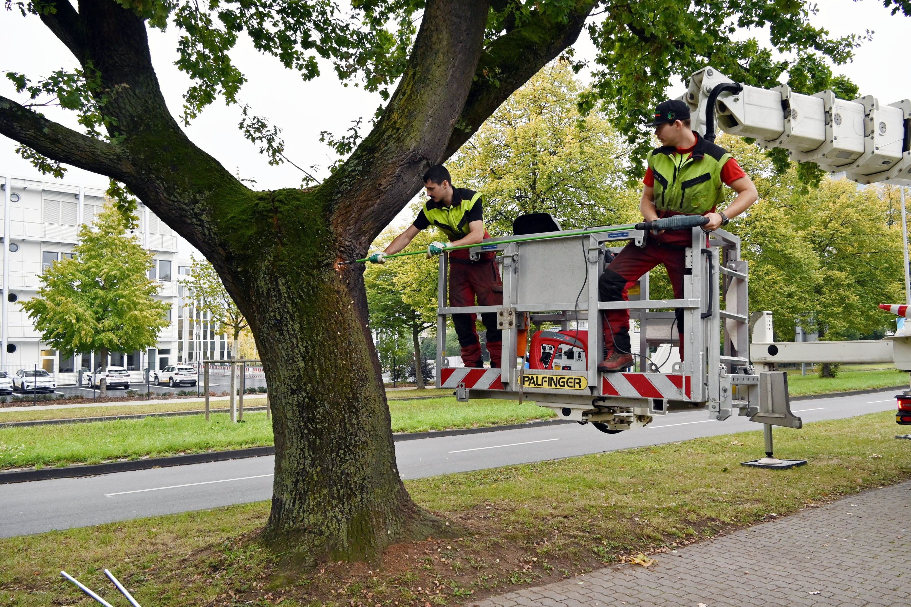 Stabilisierung und klimaresistente Nachpflanzung sichern urbanen Baumbestand trotz KlimawandelAn der Schlachthofstraße wurde eine rund 70 Jahre alte Hänge-Stieleiche (Quercus robur 'Pendula') nach einem Stammriss aufwendig stabilisiert, um die Verkehrssicherheit zu gewährleisten. Mithilfe der Verbolzung, bei der verzinkte Gewindestangen durch den Stamm geführt wurden, soll der Baum mindestens zehn weitere Jahre erhalten bleiben. Ergänzend wird im Herbst eine klimaresistente ungarische Eiche (Quercus frainetto) gepflanzt, die besser an Trockenheit und Hitze angepasst ist. Diese Maßnahmen verdeutlichen den nachhaltigen Umgang mit urbanem Baumbestand im Angesicht des Klimawandels.