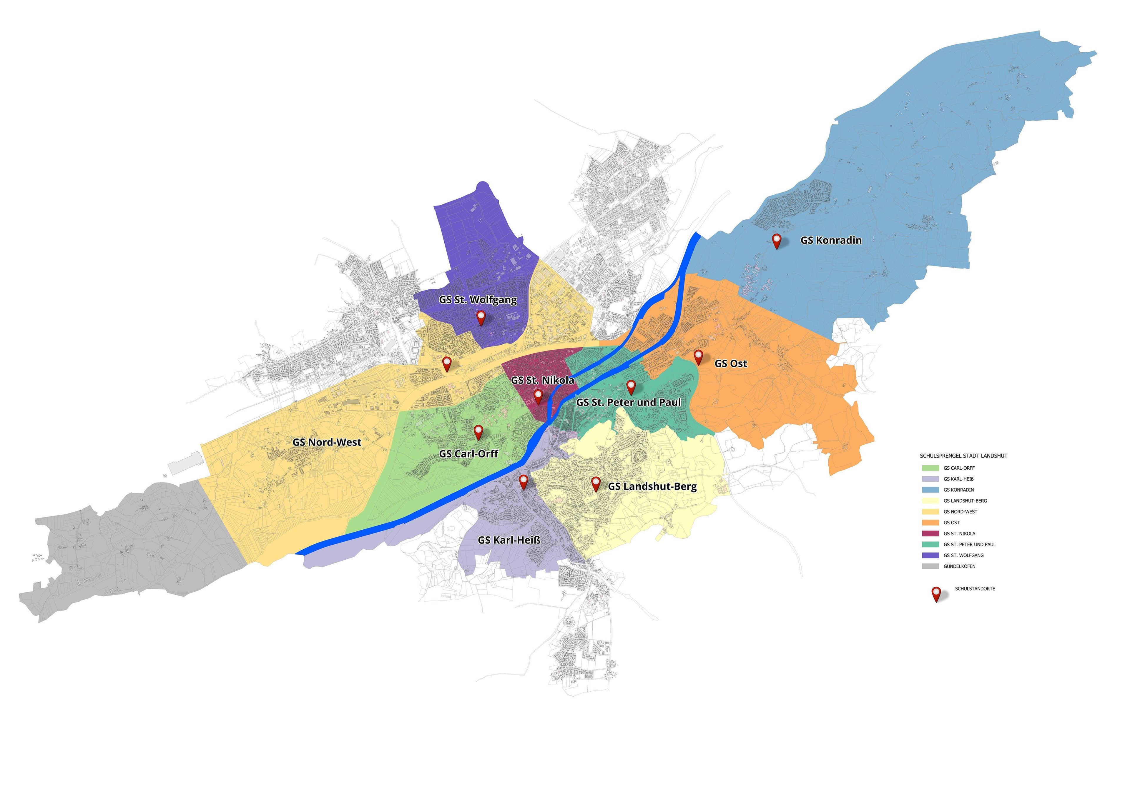 Mit dem Neubau der Grundschulen Nord-West und Ost passt Landshut das Einzugsgebiet seiner Grundschulen an. Rund 450 Schülerinnen und Schüler der Jahrgangsstufen 1 bis 3 wechseln ab dem Schuljahr 2026/27 ihre Schule. Die Anpassungen entlasten bestehende Schulen wie Carl-Orff, Wolfgang, St. Nikola und berücksichtigen neue Gebietszuweisungen unter anderem für Schönbrunn am Schallermoos.