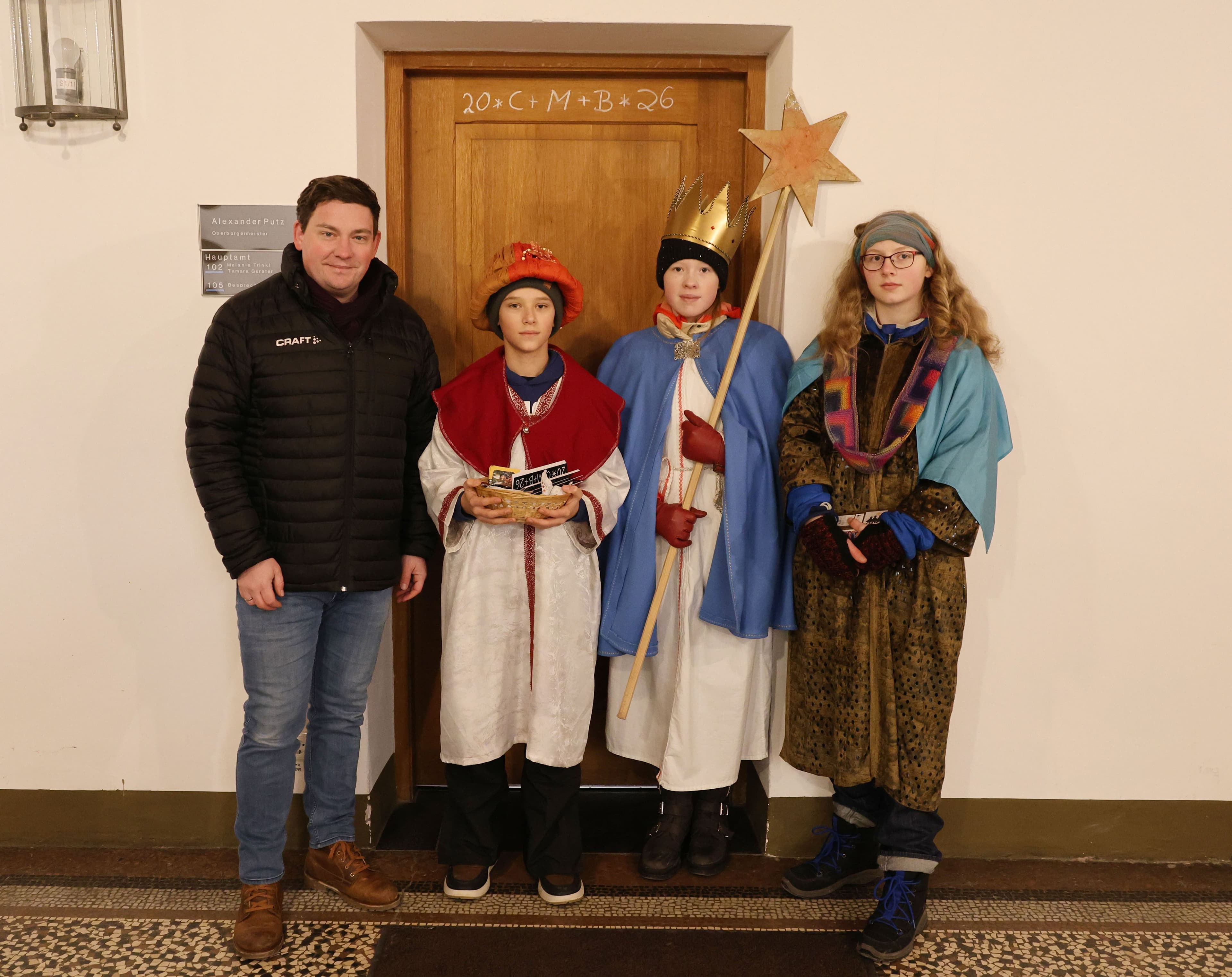 Drei Sternsinger der Pfarrei St. Jodok besuchten am Montagnachmittag das Landshuter Rathaus und überreichten dem Zweiten Bürgermeister Dr. Thomas Haslinger den traditionellen Neujahrssegen. Mit dem lateinischen Spruch „mansionem benedicat“ und dem Segenszeichen 20*C+M+B*26 wünschten sie Schutz und Segen für das neue Jahr. Haslinger dankte den Kindern für ihr Engagement und honorierte dies mit einer Spende. Der Brauch symbolisiert nicht nur den Jahresbeginn, sondern auch soziales Engagement und Zusammenhalt.