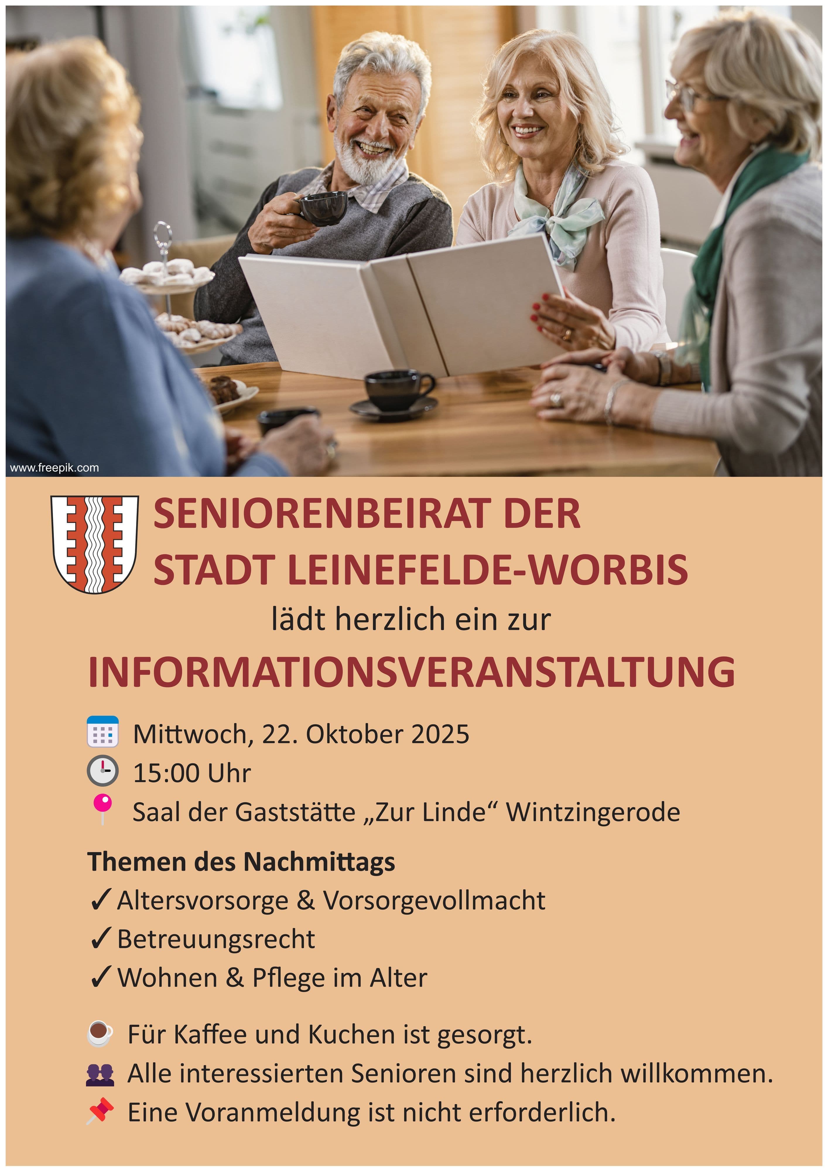 Am 22. Oktober: Altersvorsorge, Betreuungsrecht und Pflege bei Kaffee und KuchenAm Mittwoch, 22. Oktober 2025, lädt die Stadt Leinefelde-Worbis zu einer Informationsveranstaltung für Seniorinnen und Senioren ein. Im Saal der Gaststätte "Zur Linde" in Wintzingerode werden ab 15 Uhr Themen wie Altersvorsorge, Betreuungsrecht sowie Wohnen und Pflege im Alter praxisnah vorgestellt. Die Teilnahme ist ohne Anmeldung möglich, und bei Kaffee und Kuchen gibt es Gelegenheit zum Austausch.