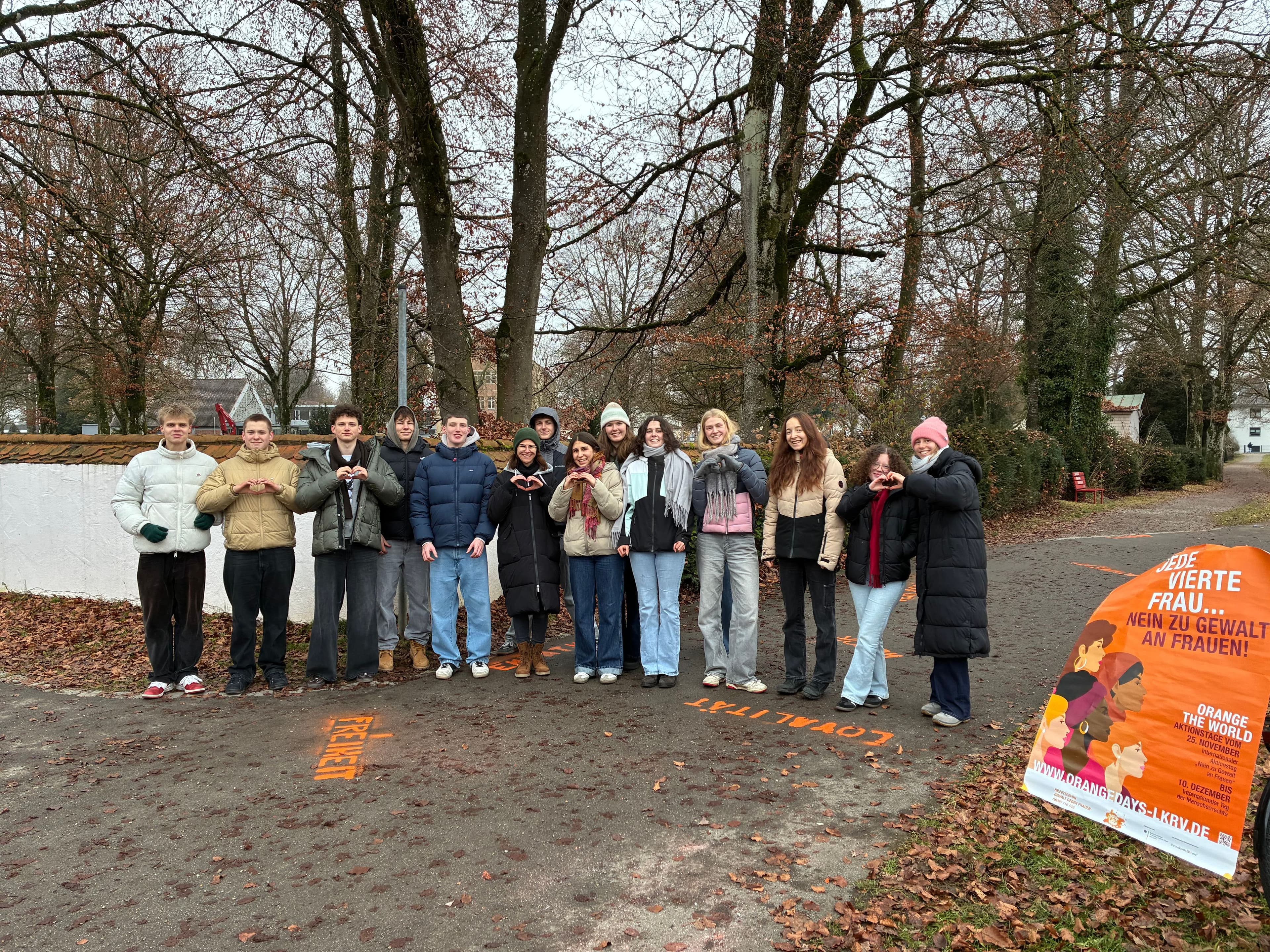 Das Hans-Multscher-Gymnasium und engagierte SchĂŒlerinnen und SchĂŒler fĂŒhrten unter der Leitung von Lehrerin Anuschka Wolfram die Aktion âOrange Botschaften gegen Gewaltâ durch, um Bewusstsein fĂŒr respektvolle Beziehungen zu schaffen. Mit Kreidespray trugen sie Werte wie Vertrauen und Liebe sichtbar in der Stadt auf und verteilten Informationsflyer. ErgĂ€nzend erinnern 14 rote BĂ€nke mit dem Schriftzug âKein Platz fĂŒr Gewaltâ an das Engagement der Stadt gegen hĂ€usliche Gewalt.