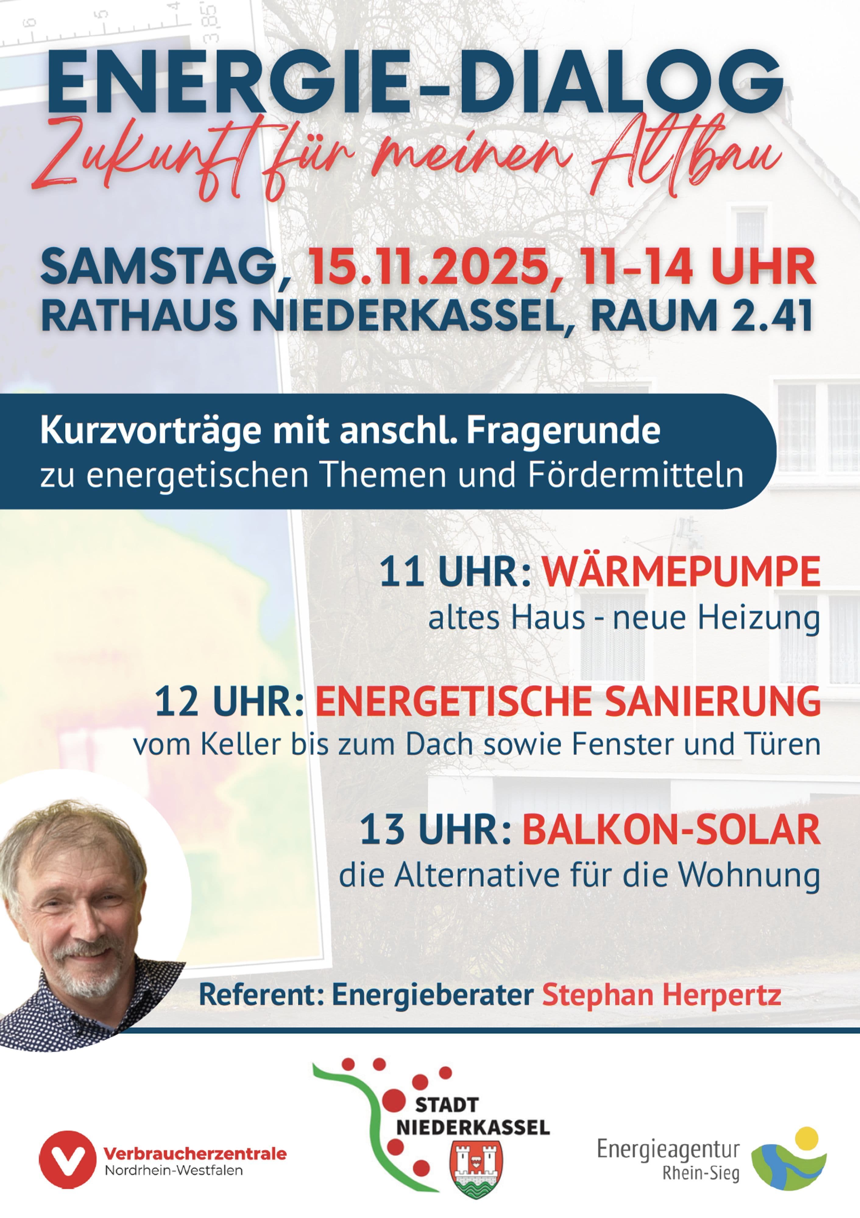 Am 15. November 2025 lädt die Stadt Niederkassel zum „Energie-Dialog“ ins Rathaus ein. Energieexperte Stephan Herpertz informiert ab 11 Uhr zu Wärmepumpen, energetischer Sanierung und Balkon-Solar. Die Teilnahme ist frei und ohne Anmeldung möglich; zudem gibt es Beratungen vor Ort und digital.