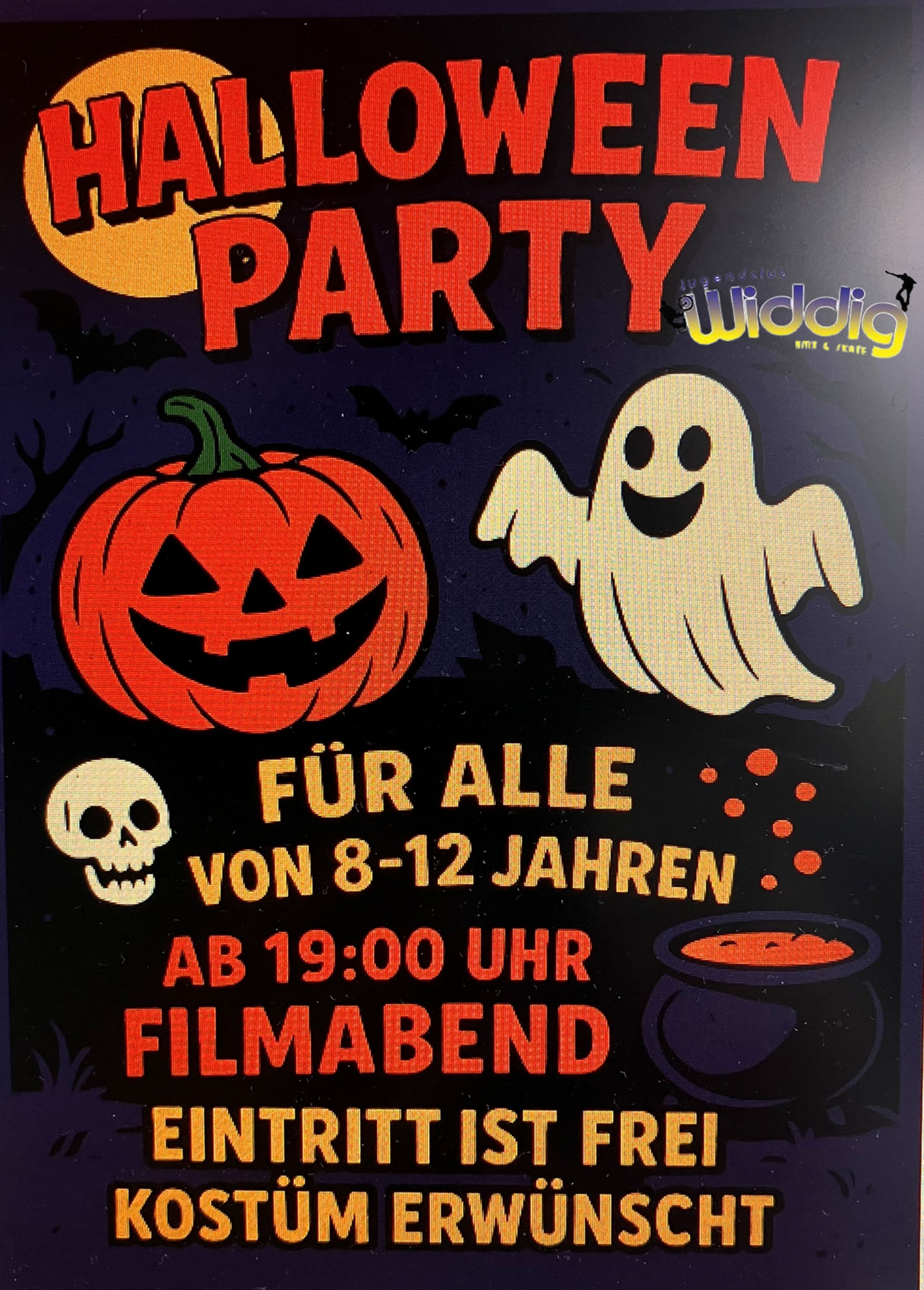 Am 31. Oktober 2025 lädt die Stadt Niederkassel zu einer Halloween Party im Jugendclub Widdig ein. Von 16:00 bis 19:00 Uhr erwartet Kinder und Jugendliche ab 8 Jahren ein Programm mit Musik, Snacks und Getränken in gruseliger Atmosphäre. Im Anschluss beginnt ab 19:00 Uhr ein Gruselfilmabend für Jugendliche ab 14 Jahren.
