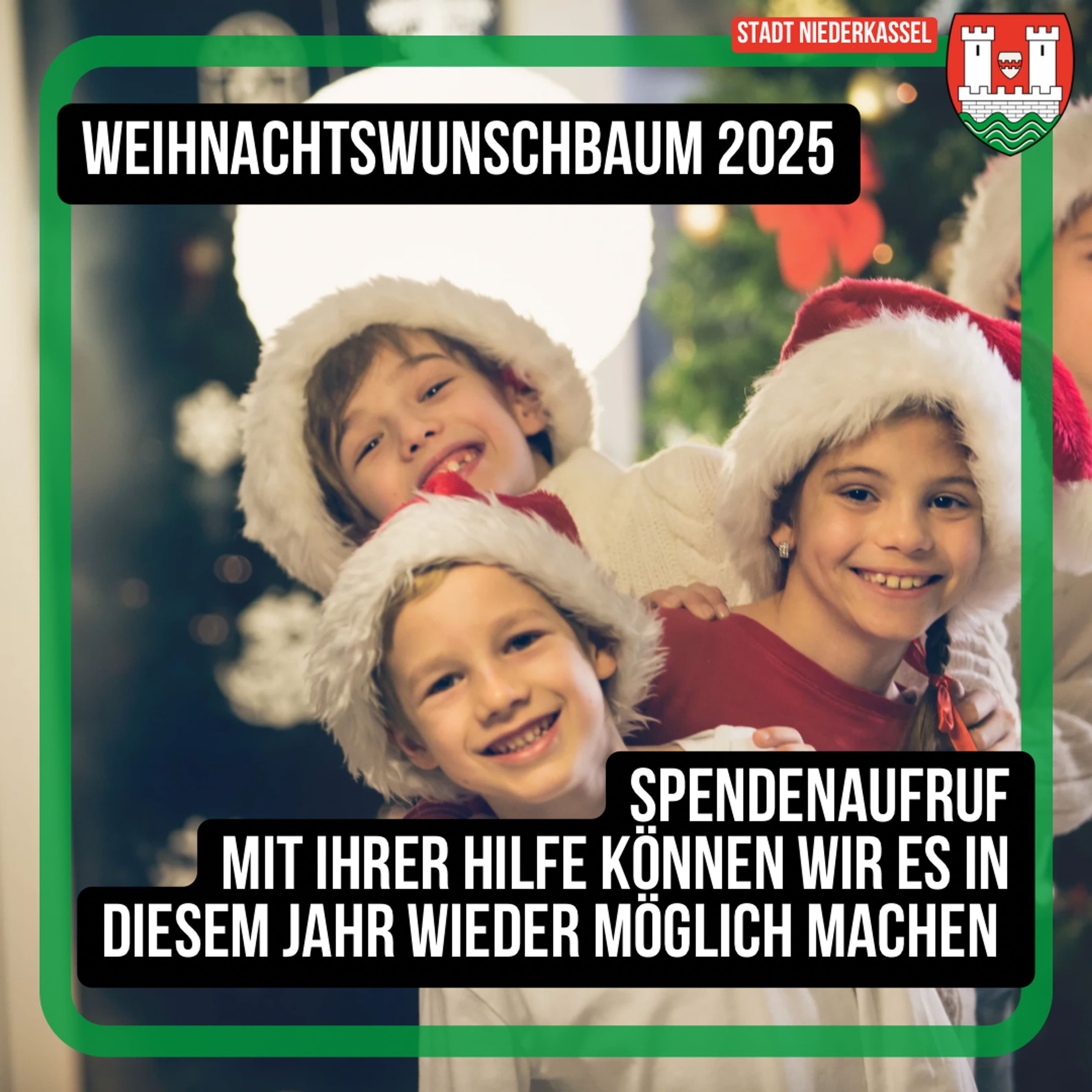 Spenden für Gutscheine helfen Kindern aus benachteiligten Familien, ihre Weihnachtswünsche selbst zu erfüllenDie Stadt Niederkassel ruft zur Teilnahme an der Weihnachtswunschbaumaktion 2025 auf, um Kindern aus finanziell benachteiligten Familien zu Weihnachten eine Freude zu bereiten. Die Wünsche werden in Gutscheinen lokaler Geschäfte erfüllt, sodass die Kinder ihre Geschenke selbst auswählen können. Spenden sind auf spezielle Konten mit dem Verwendungszweck „Weihnachtswunschbaum 2025“ willkommen. Die Stadt dankt allen Unterstützerinnen und Unterstützern für die wertvolle Hilfe bei dieser etablierten Aktion.