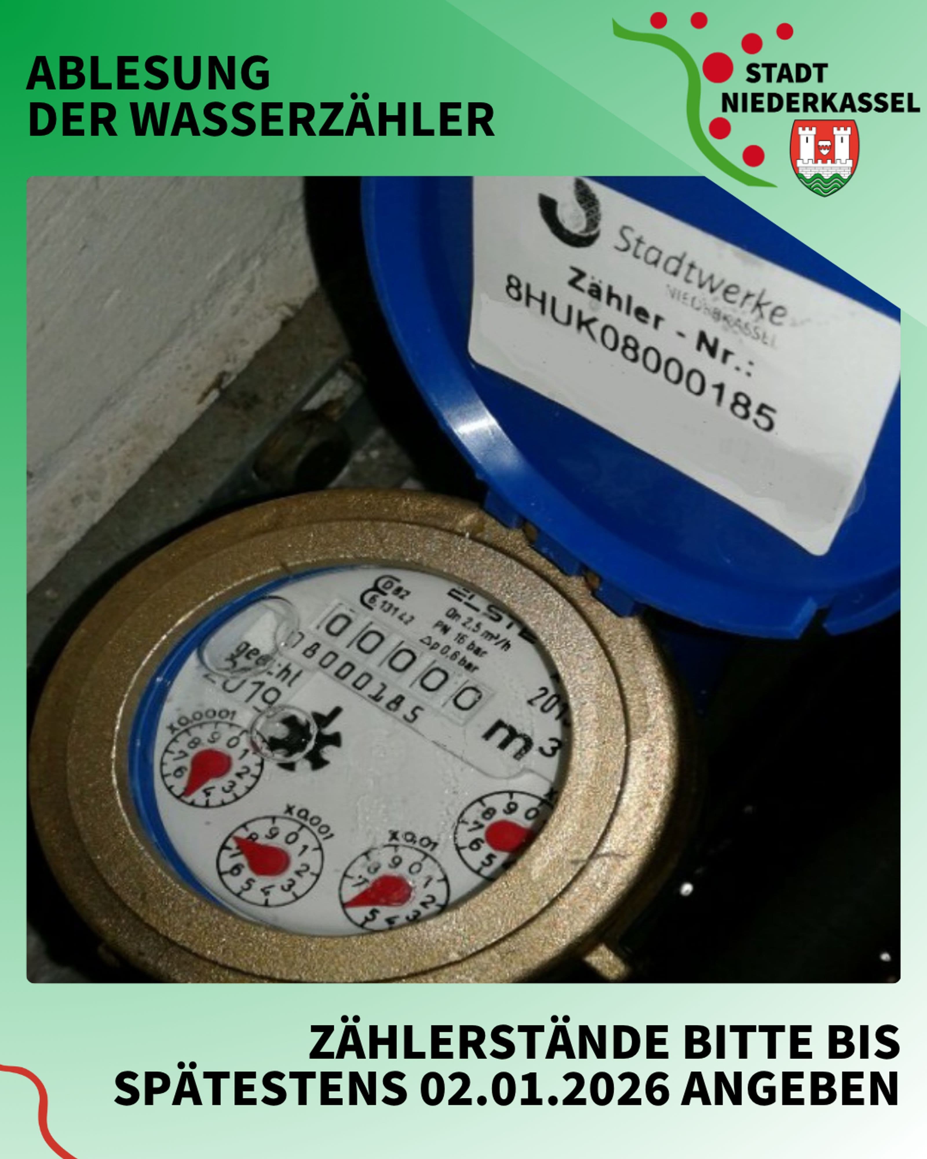 Stadtwerke Niederkassel erinnern an Meldung bis 2. Januar 2026 – Online, per Post oder im Rathaus möglichDie Stadtwerke Niederkassel erinnern an die Ablesung der Wasserzähler bis spätestens 2. Januar 2026. Die Ablesekarten werden am 28. November 2025 verschickt, die Meldung kann online, per Post oder im Rathaus erfolgen.