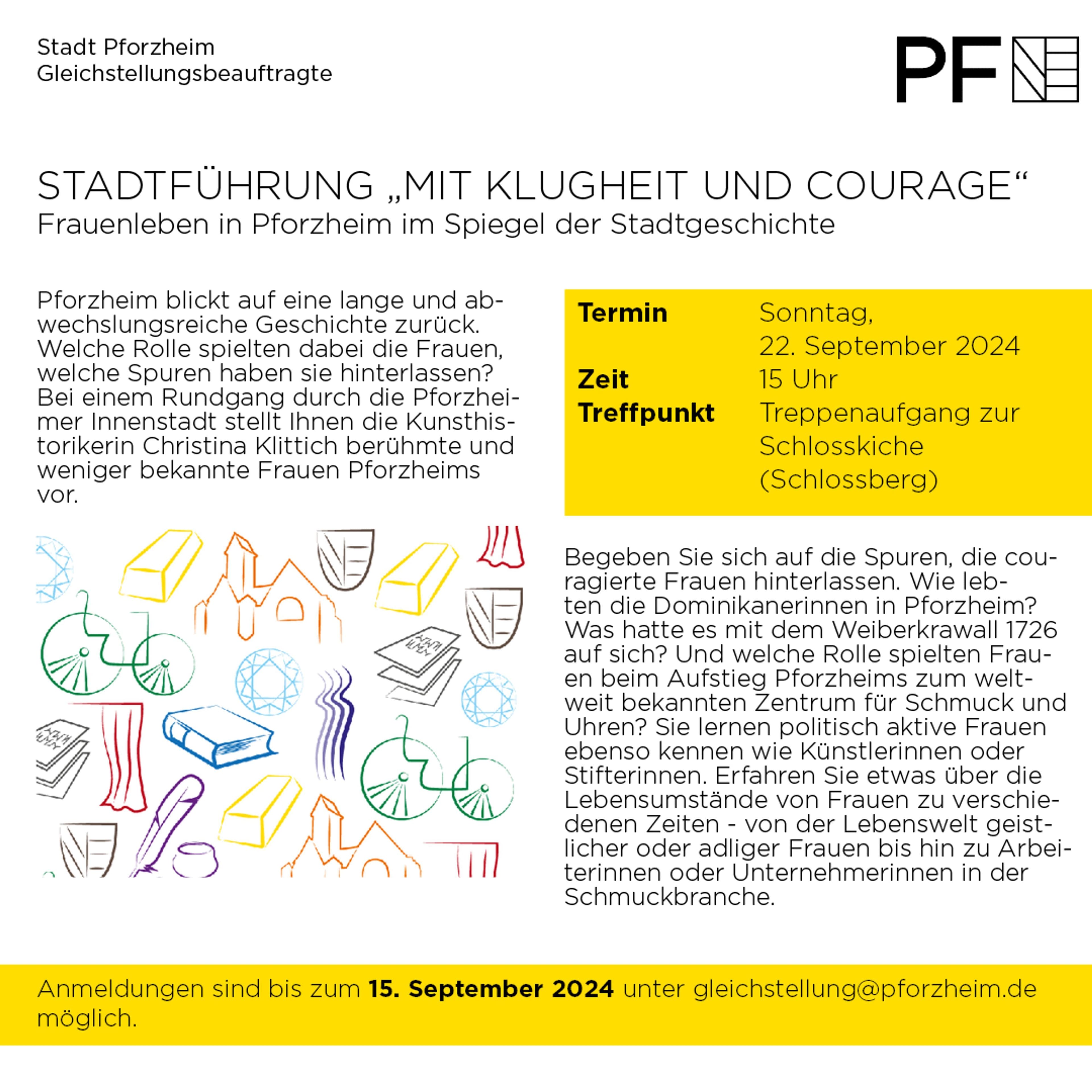 Die erste Führung trägt den Titel „Mit Klugheit und Courage. Frauenleben in Pforzheim im Spiegel der Stadtgeschichte“ und findet am Sonntag, 22. September, statt. Treffpunkt ist der Treppenaufgang zur Schlosskirche am Schlossberg. Die Teilnehmer haben die Möglichkeit, die Geschichten mutiger Frauen zu erkunden, die Pforzheims Geschichte geprägt haben.
