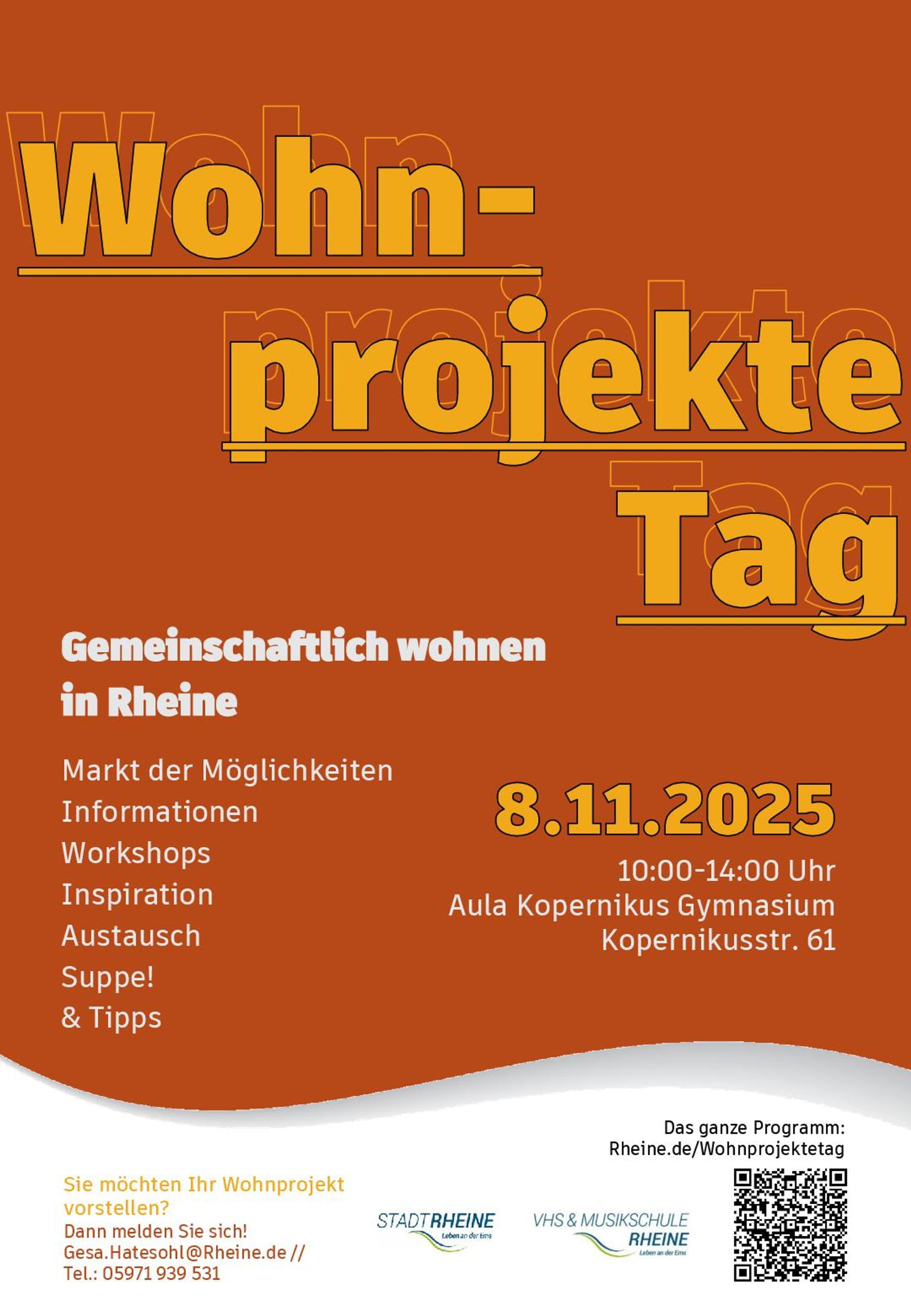 Wohnprojektetag am 8. November mit Workshops und Austausch im Kopernikus GymnasiumAm 8. November 2025 findet im Kopernikus Gymnasium in Rheine von 10 bis 14 Uhr ein Wohnprojektetag rund um gemeinschaftliches Wohnen statt. Unterschiedliche Wohnformen, von selbstorganisierten Gruppen bis zu kommunalen Modellen, werden vorgestellt, um aktivierte Nachbarschaften und Ressourcenteilung zu fördern.