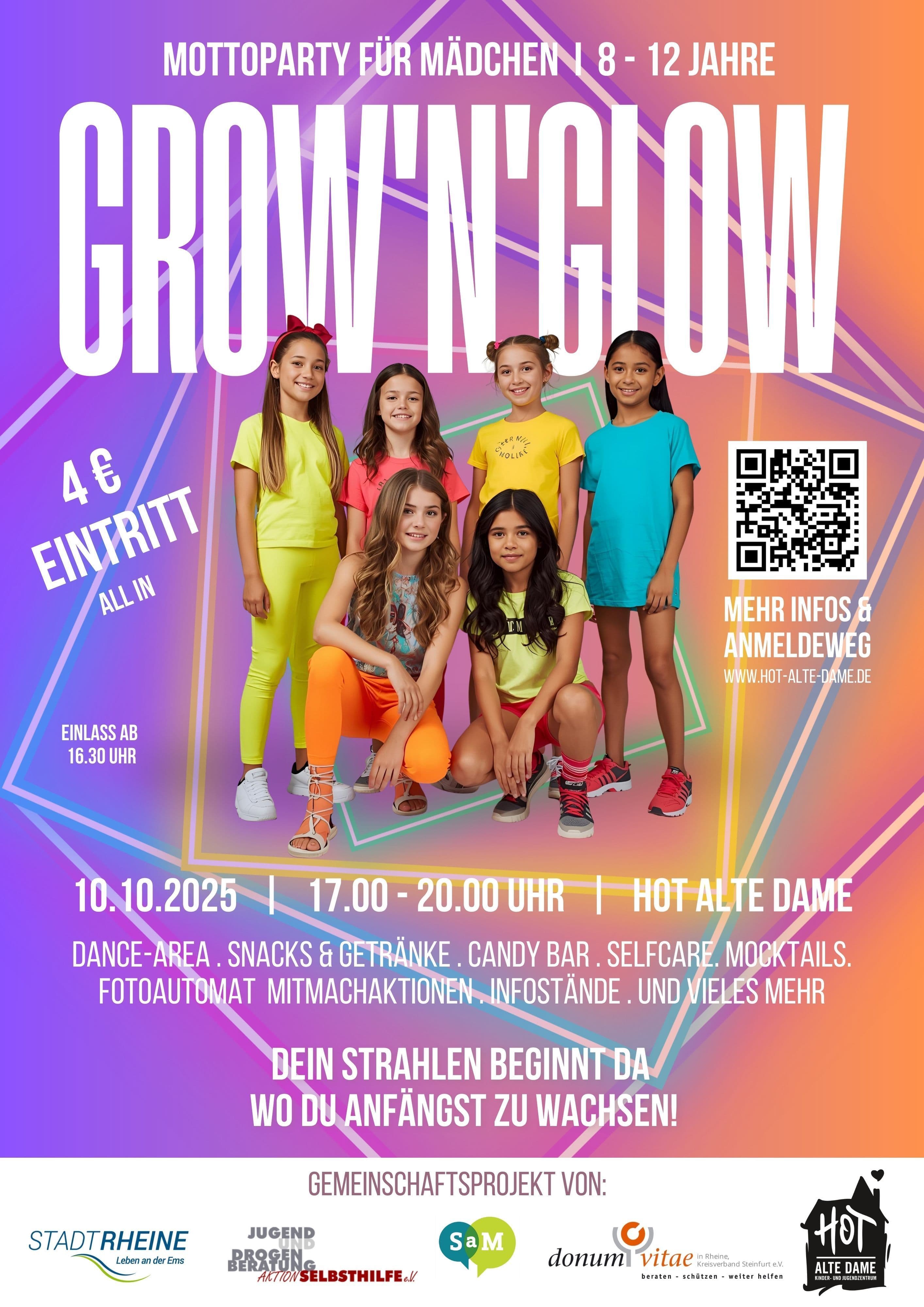 Am 10. Oktober erwartet 8- bis 12-Jährige ein buntes Programm mit Musik, Tanz und Candy Bar – Anmeldung über Familien App erforderlichAm Freitag, 10. Oktober 2025, lädt das HOT Alte Dame in Rheine zur Mottoparty GROW’N’GLOW für Mädchen von 8 bis 12 Jahren ein. Neben Musik, Tanz und einer Candy Bar erwartet die Teilnehmerinnen ein buntes Programm mit leuchtender Dekoration und einem Fotoautomaten. Die Veranstaltung ist das Ergebnis einer Kooperation mehrerer lokaler Partner und legt besonderen Wert auf Sicherheit und Gemeinschaft. Der Eintritt beträgt 4 Euro, eine Anmeldung über die Familien App Rheine ist erforderlich.