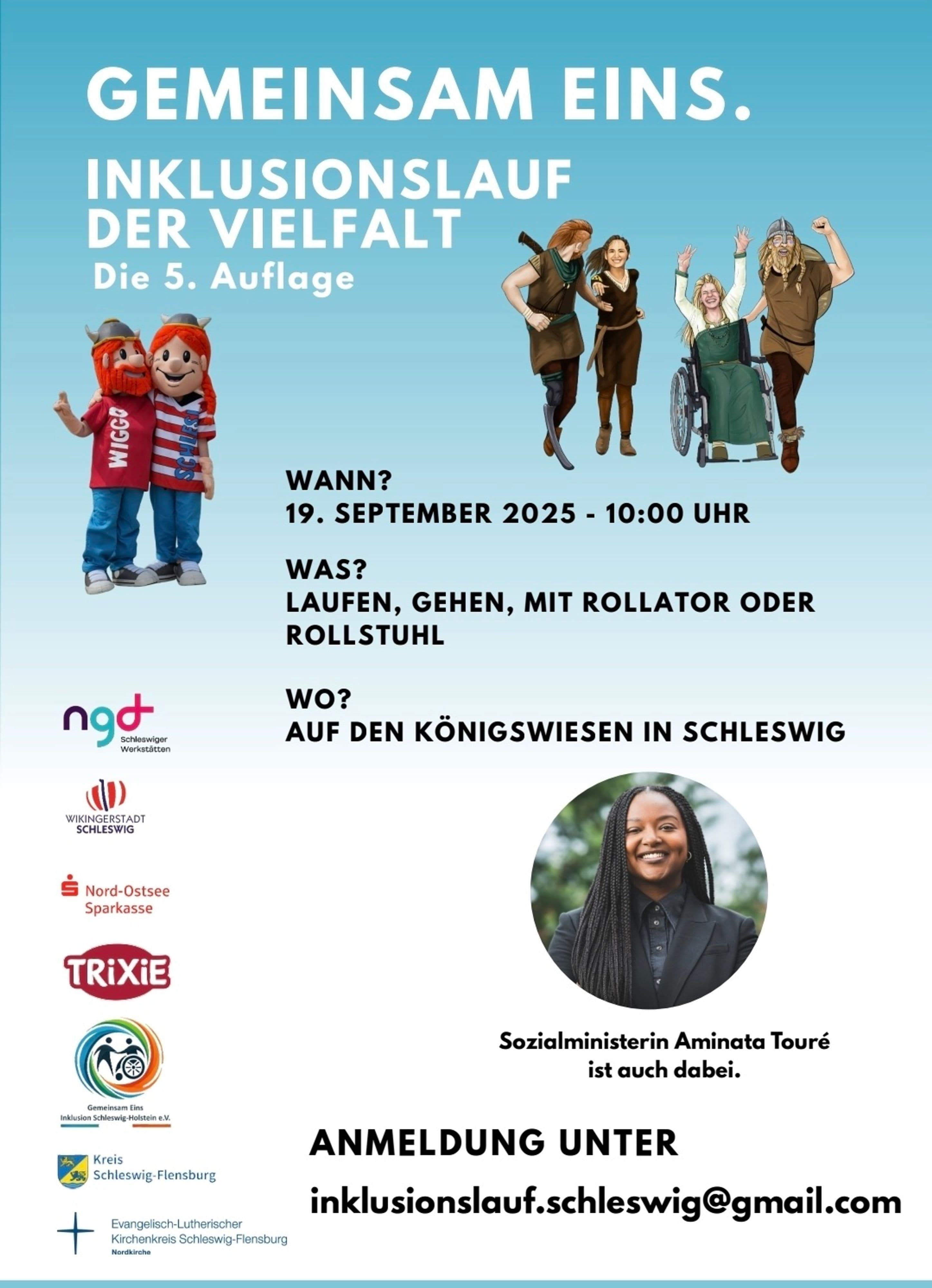 Fast 1.000 Teilnehmer setzen am 19. September ein Zeichen für Respekt und ZusammenhaltAm 19. September 2025 findet in Schleswig zum fünften Mal der Inklusionslauf der : Gemeinsam Eins statt, der Menschen mit und ohne Behinderung einlädt, gemeinsam ein Zeichen für Respekt und Zusammenhalt zu setzen. Die 600 Meter lange Strecke auf den Königswiesen kann beliebig oft zurückgelegt werden – unabhängig von der Mobilitätsform. Mit fast 1.000 Anmeldungen kündigt sich ein neuer Teilnehmerrekord an, zudem unterstützt Sozialministerin Aminata Touré das Event. Die Stadt Schleswig lädt alle ein, aktiv dabei zu sein oder als Zuschauer das inklusive Gemeinschaftsgefühl zu fördern.