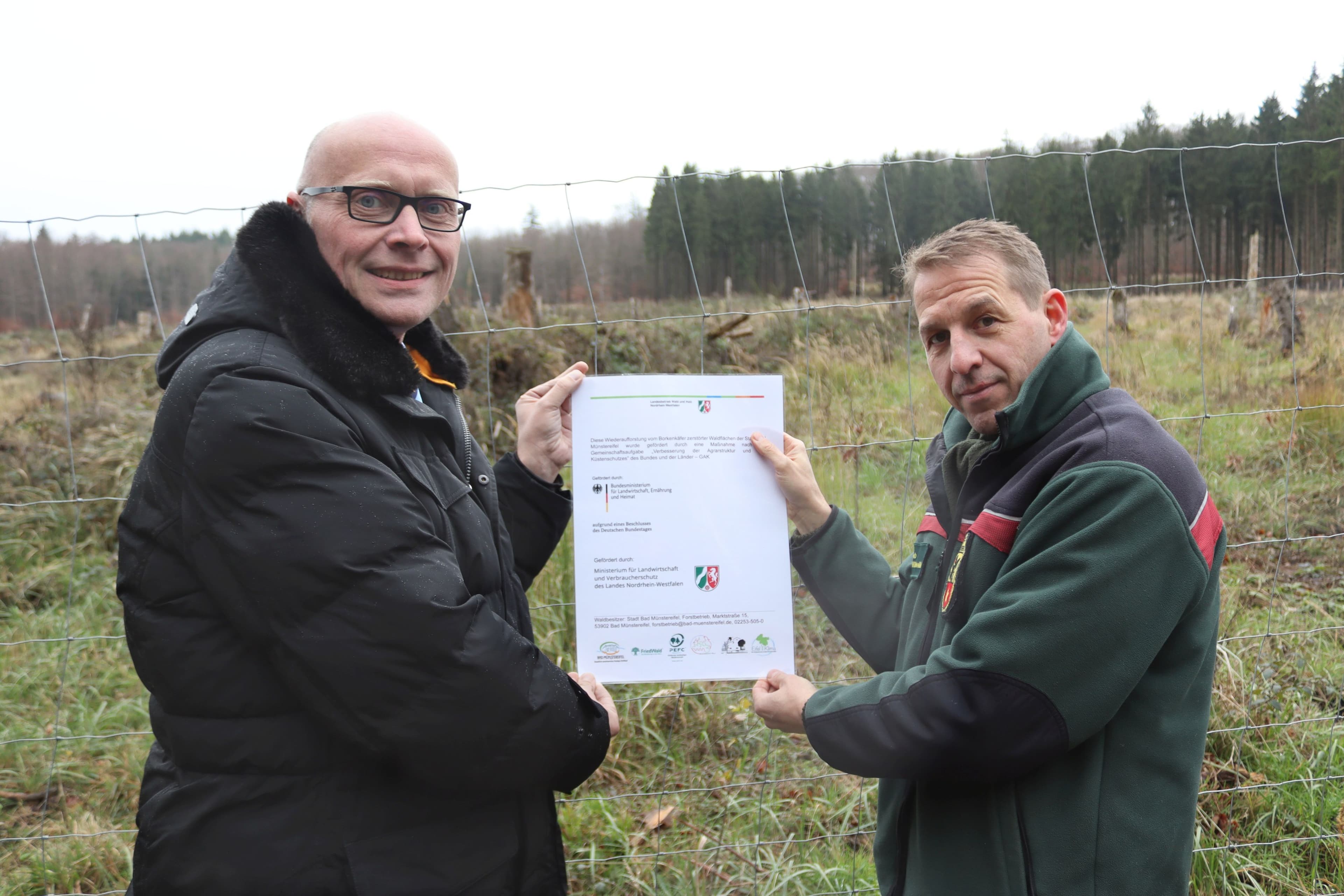 Die Wiederaufforstung wird mit rund 128.000 Euro Landesmitteln gefördert und von den Forstexperten Stefan Lott und Sebastian Glatzel begleitet. Das Waldbaukonzept orientiert sich an ökologischen und wirtschaftlichen Gesichtspunkten.