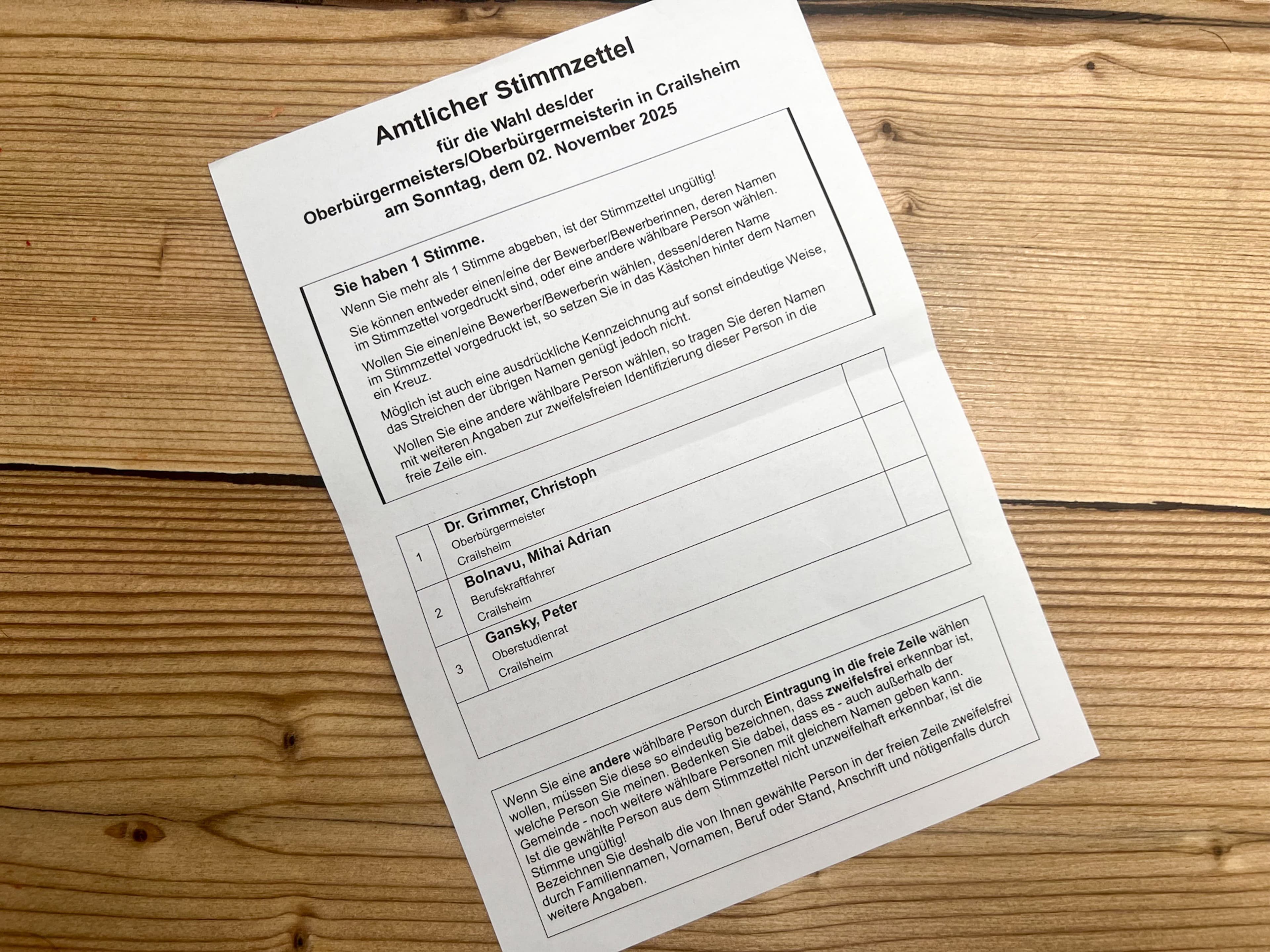 Die Bürgerinnen und Bürger Crailsheims wählen am 2. November ihr neues Stadtoberhaupt, das die nächsten acht Jahre die Stadt leiten wird. Die Wahllokale sind von 8:00 bis 18:00 Uhr geöffnet; sollte kein Kandidat die erforderliche Mehrheit erreichen, folgt am 30. November eine Stichwahl.