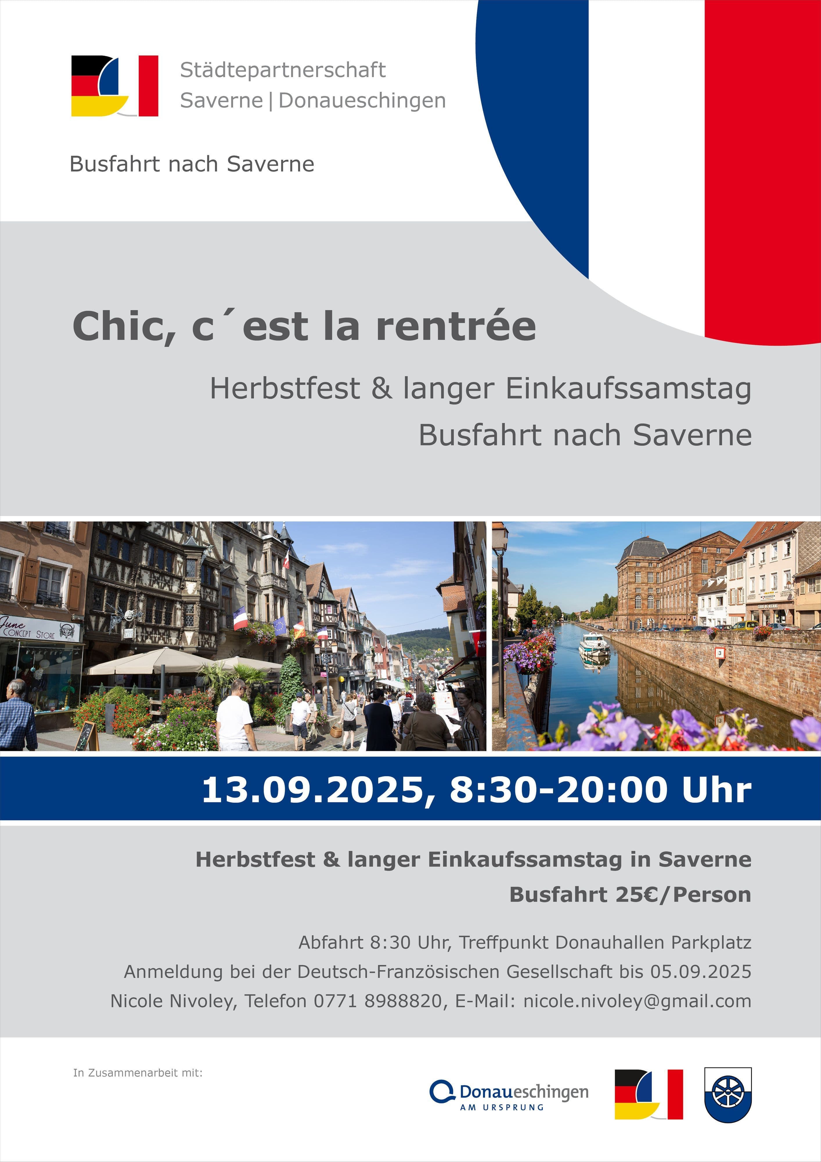 Busfahrt am 13. September mit Musik, Markt und elsässischem Flair – jetzt bis 5. September anmeldenAm 13. September 2025 lädt das Kulturamt Donaueschingen gemeinsam mit der Deutsch-Französischen Gesellschaft zu einer Busfahrt zum Herbstfest „Chic, c’est la rentrée“ in die Partnerstadt Saverne ein. Die Veranstaltung verbindet französisches Flair, Musik und einen langen Einkaufssamstag zu einem erlebnisreichen Tag. Die Hin- und Rückfahrt kostet 25 Euro, Anmeldung bis zum 5. September erforderlich.