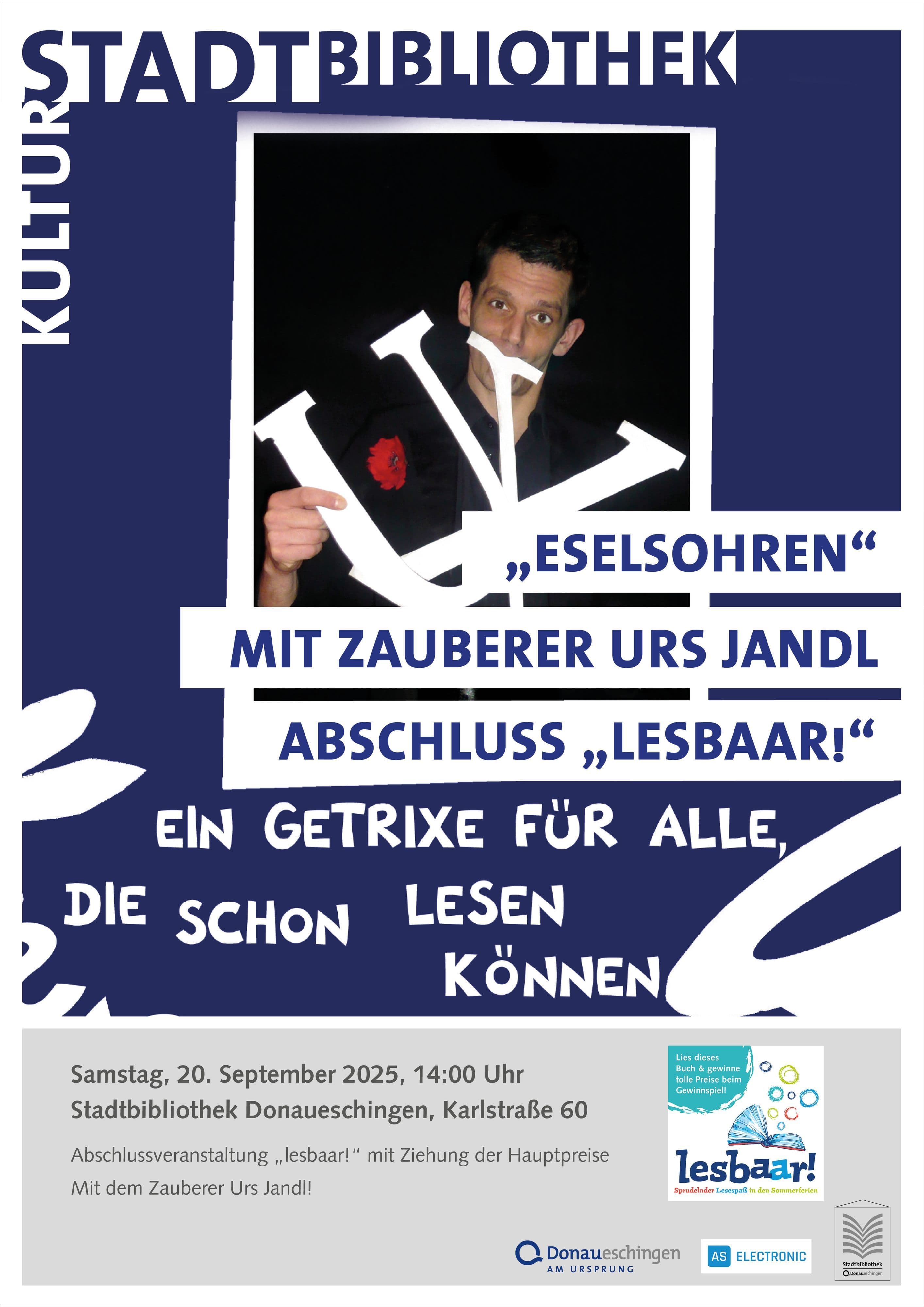 Die Stadtbibliothek Donaueschingen lädt am Samstag, 20. September 2025, ab 14 Uhr zum Abschlussfest des Sommerleseclubs „Lesbaar!“ ein. Von 209 angemeldeten Jugendlichen lasen 146 aktiv mit und nehmen an der Preisverlosung teil. Das Programm umfasst eine Zaubershow des Künstlers Urs Jandl sowie die Verteilung von Hauptpreisen, Gutscheinen und Urkunden.