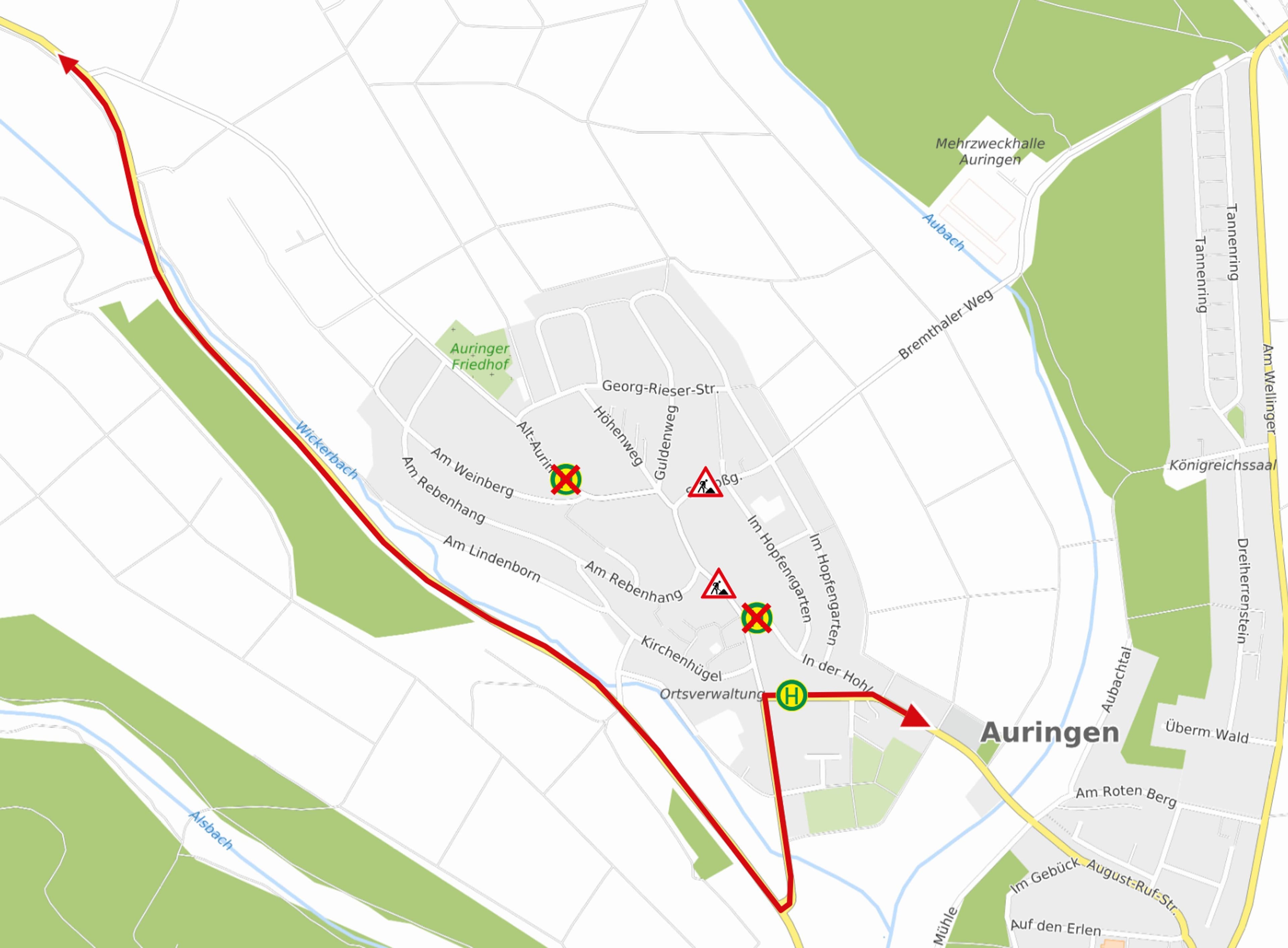 Am Dienstag, 4. November, kommt es zwischen 8:30 und 19:00 Uhr wegen Bauarbeiten zu einer Vollsperrung der Straßen Alt-Auringen und Schlossgasse. Die Buslinien 21, N10 sowie die ESWE-Schulbusse können die Haltestellen „Am Weinberg” und „Alt-Auringen” nicht bedienen; als Ersatz dient die Haltestelle August-Ruf-Straße in beiden Richtungen.