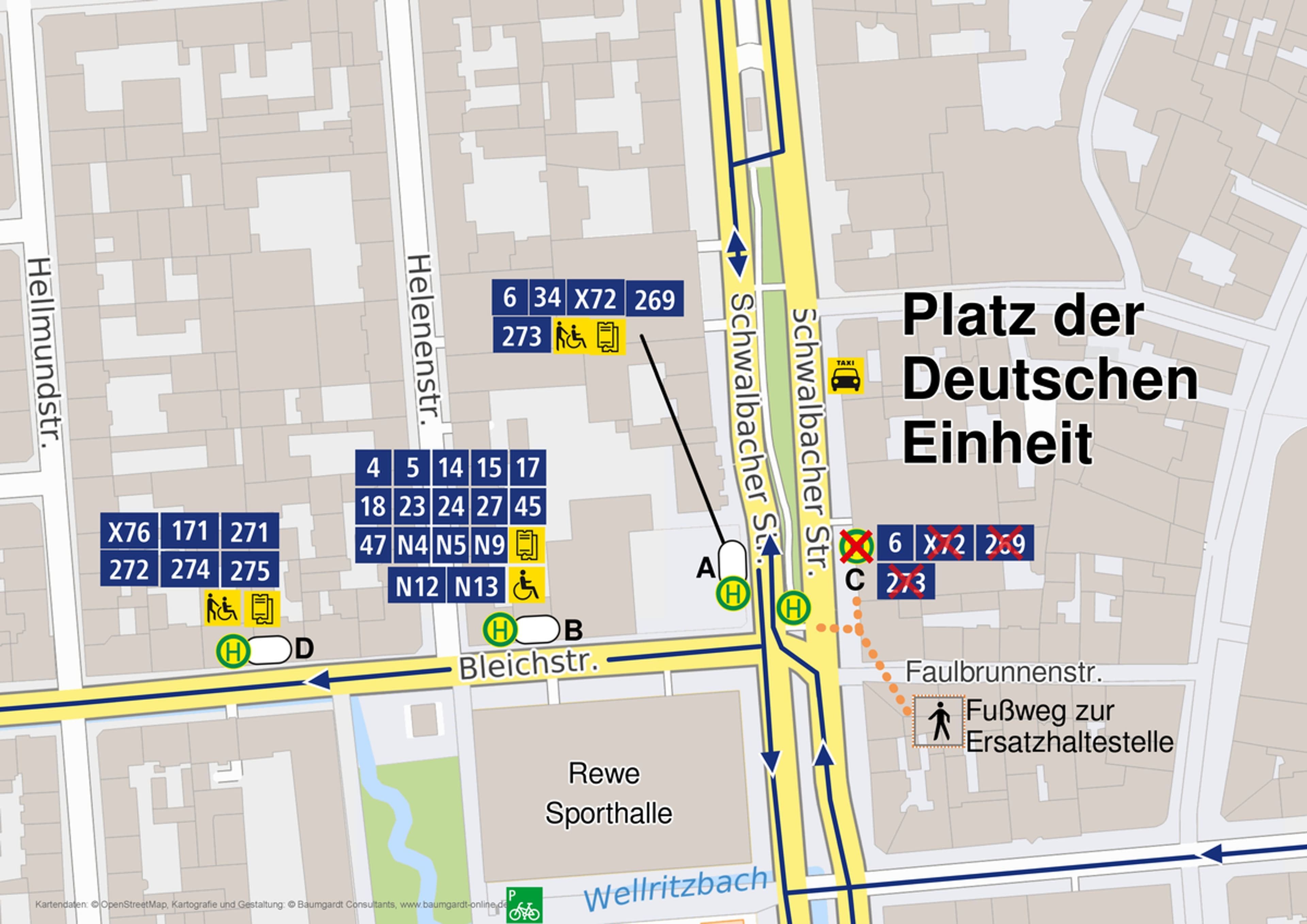 Wegen Bauarbeiten in der Schwalbacher Straße wird der Bussteig C an der Haltestelle „Platz der Deutschen Einheit“ ab dem 19. Januar auf den Mittelstreifen verlegt. Diese Maßnahme dauert voraussichtlich bis zum 14. März. Fahrgäste sollten dies bei ihrer Routenplanung berücksichtigen.