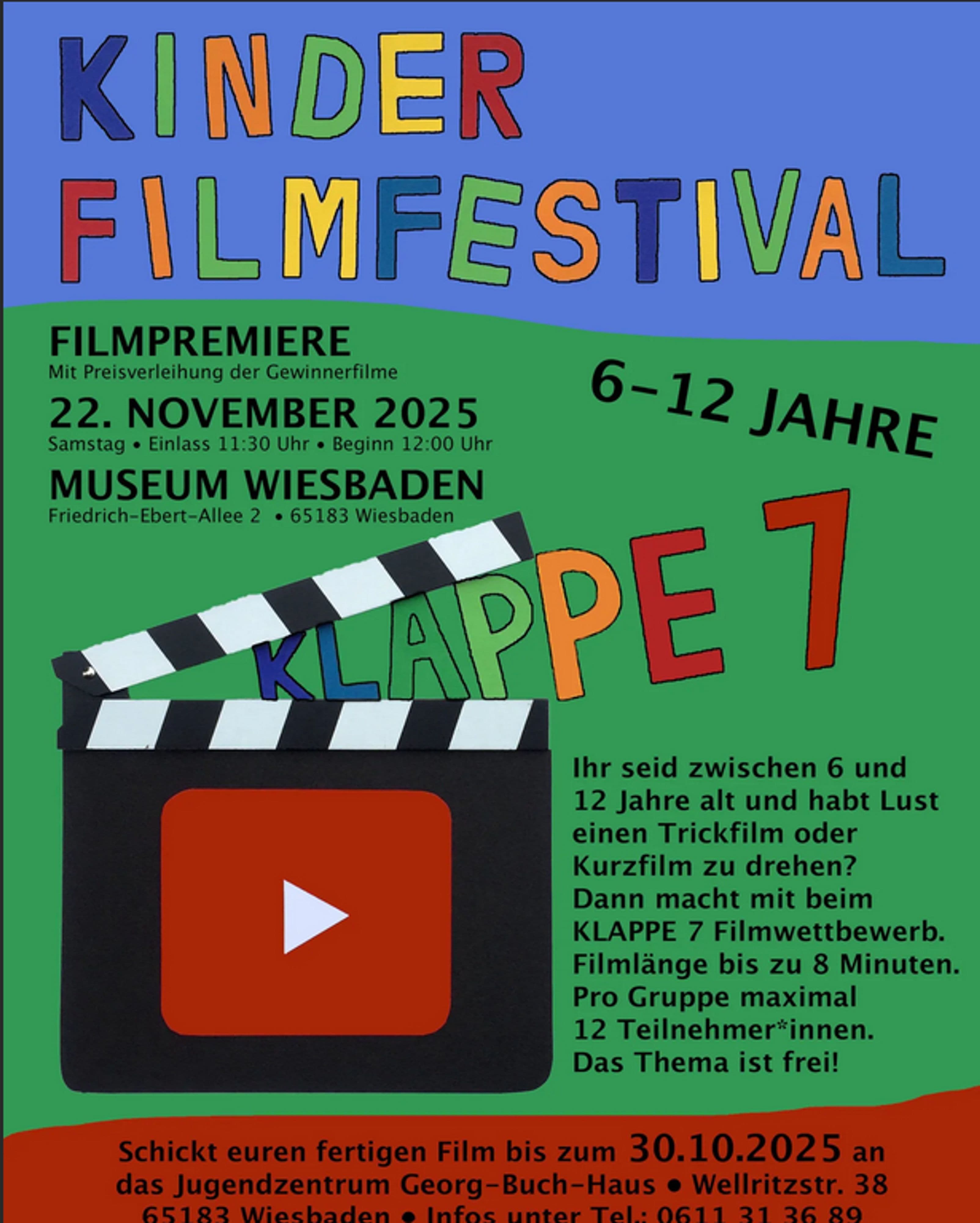 Premiere selbst produzierter Kurzfilme von 6- bis 12-JĂ€hrigen im Museum Wiesbaden am 22. NovemberAm 22. November lĂ€dt das Kinderfilmfestival âKlappe 7â im Museum Wiesbaden ab 12 Uhr zur Premiere von Kurzfilmen ein, die Kinder im Alter von sechs bis zwölf Jahren selbst produziert haben. Die Filme, die von einzelnen Kindern oder Gruppen aus Schulen und Jugendzentren stammen, umfassen Kurzspielfilme, Dokumentationen und Animationen. Eine Fachjury und das Publikum vergeben Preise fĂŒr die besten BeitrĂ€ge. Das Festival fördert kreativitĂ€tsstĂ€rkende Kompetenzen wie Drehbuchschreiben, Kameraarbeit und Filmschnitt und zeigt die vielfĂ€ltige Sichtweise junger Talente auf die Welt.