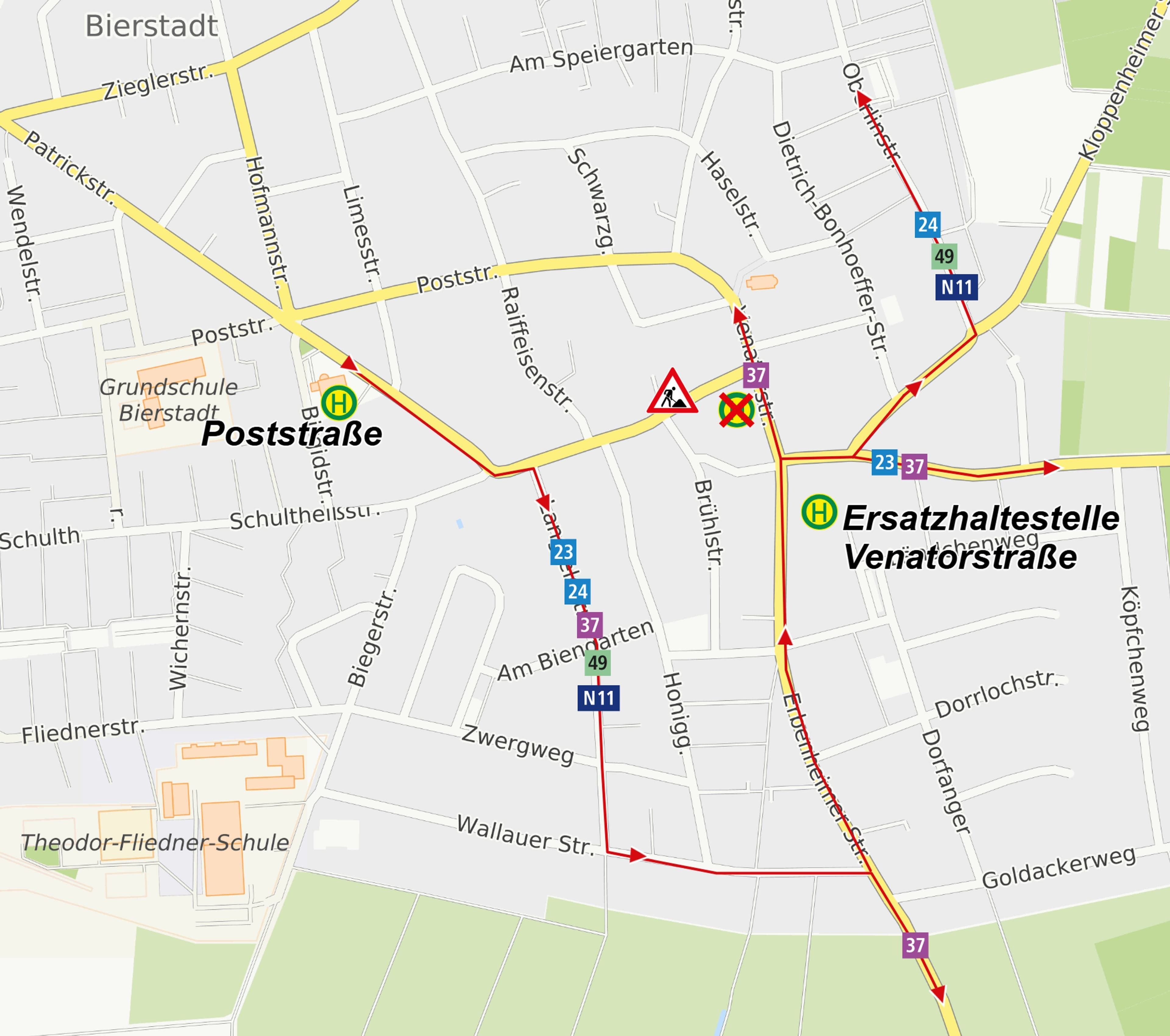 Buslinien 23, 24, 37, 49 und N11 fahren vom 4. bis 11. November Umleitungen – Ersatzhaltestellen eingerichtetDie Schultheisstraße in Wiesbaden-Bierstadt wird vom 4. bis voraussichtlich 11. November aufgrund von Bauarbeiten vollständig gesperrt. Dies führt zu Umleitungen bei den Buslinien 23, 24, 37, 49, N11 sowie bei Schulbussen von ESWE Verkehr. Ersatzhaltestellen werden eingerichtet, und Fahrgäste sollten mehr Zeit einplanen.