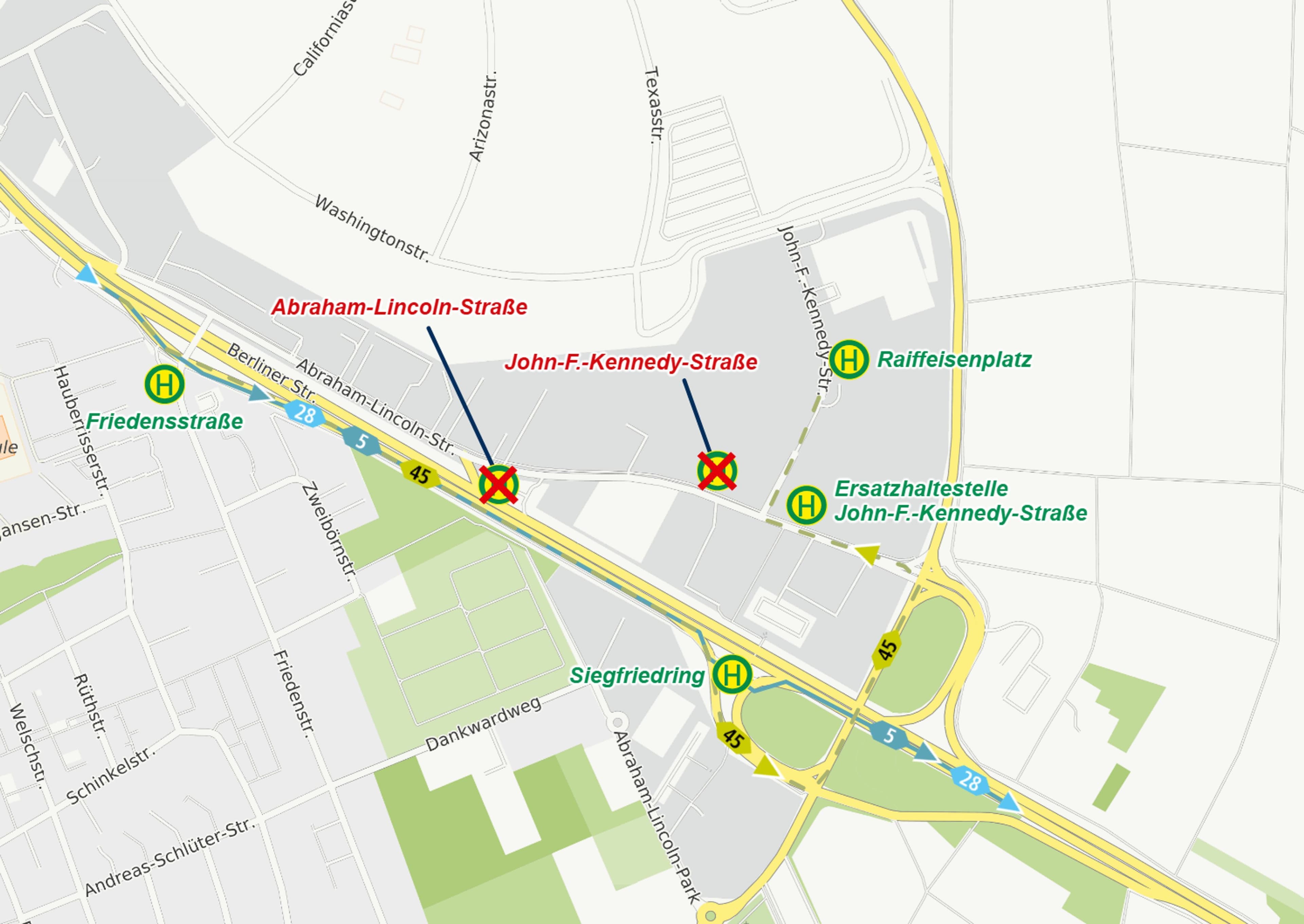In Richtung Erbenheim werden die Linien 5 und 28 ab „Friedenstraße“ über Berliner Straße, „Siegfriedring“ und „John-F.-Kennedy-Straße“ umgeleitet, wobei die Haltestelle „Abraham-Lincoln-Straße“ entfällt. Die Linie 45 nutzt ab „Friedenstraße“ die B455 mit Ersatzhalt an der „John-F.-Kennedy-Straße“. Richtung Oderstraße verkehren die Busse unverändert.