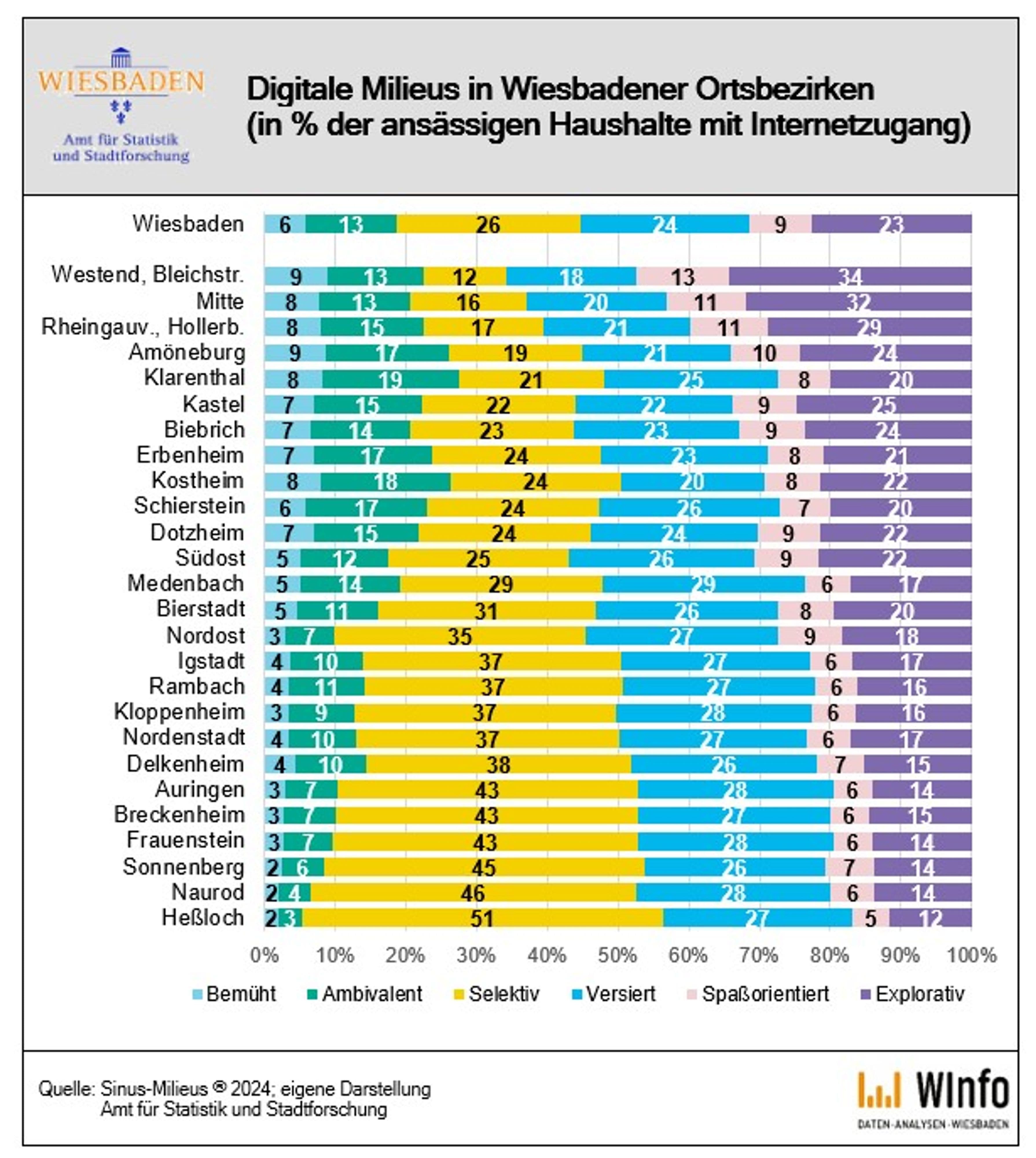 Das Amt für Statistik und Stadtforschung Wiesbaden hat erstmals neben den klassischen sozialen Milieus nach SINUS-Typologie auch digitale Milieus untersucht. Die Ergebnisse zeigen eine vielfältige und unterschiedlich geprägte Bevölkerungsstruktur im Stadtgebiet mit einem hohen Anteil Postmaterialistischer (15 %) und einem deutlichen Bedeutungsunterschied digitaler Nutzungsweisen in den Bezirken. Die Erkenntnisse sollen die zielgruppengerechte Stadtentwicklung und Kommunikation unterstützen.