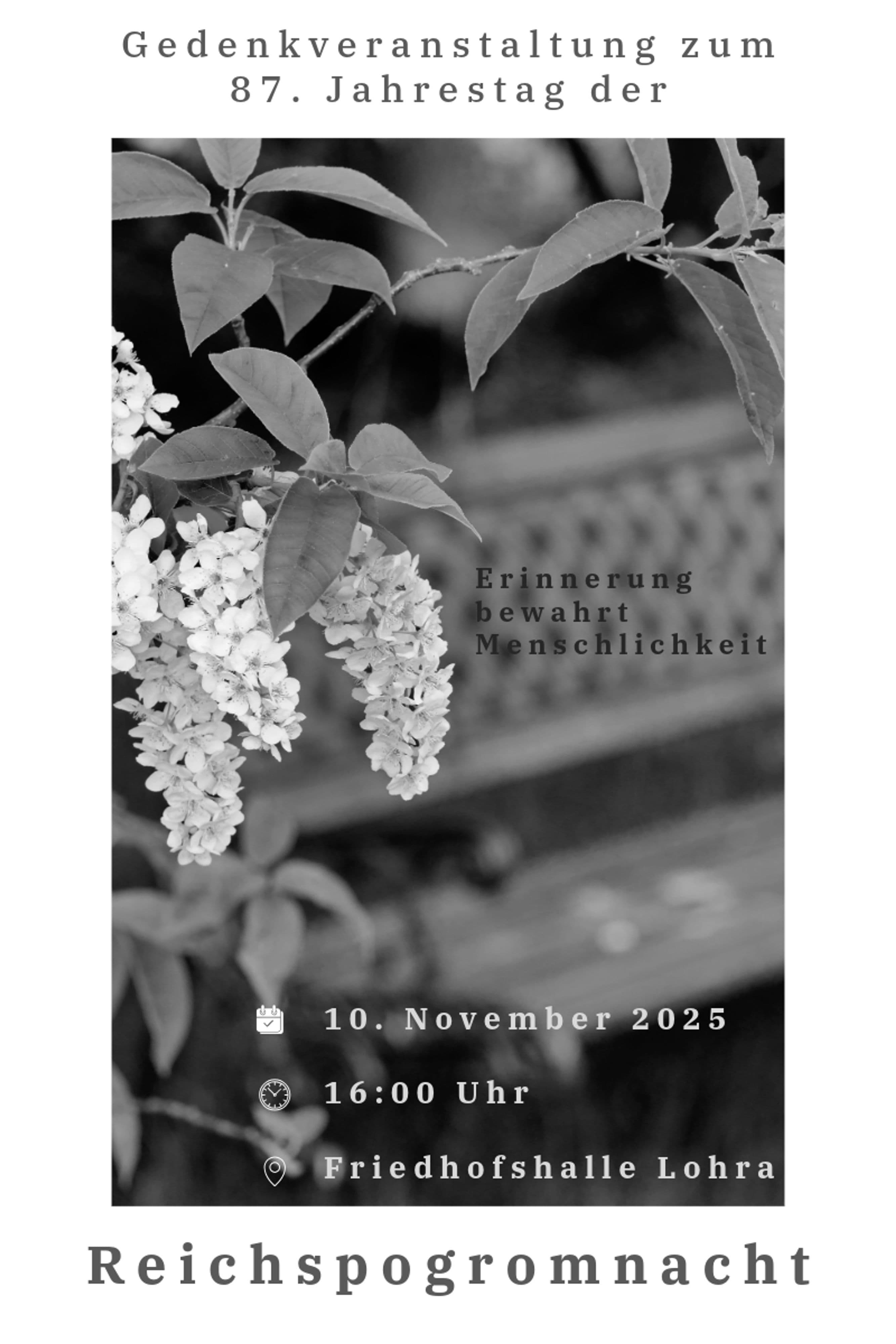Am Montag, 10. November 2025, um 16:00 Uhr findet in der Friedhofshalle Lohra die Gedenkveranstaltung „Wider das Vergessen“ statt. Redner sind Pfarrer Christian Hölscher, Kreistagsvorsitzender Detlef Ruffert und Thorsten Schmermund von der Jüdischen Gemeinde Marburg, musikalisch begleitet von Sibylle Ammenhäuser und Dr. Rüdiger Nierwetberg.