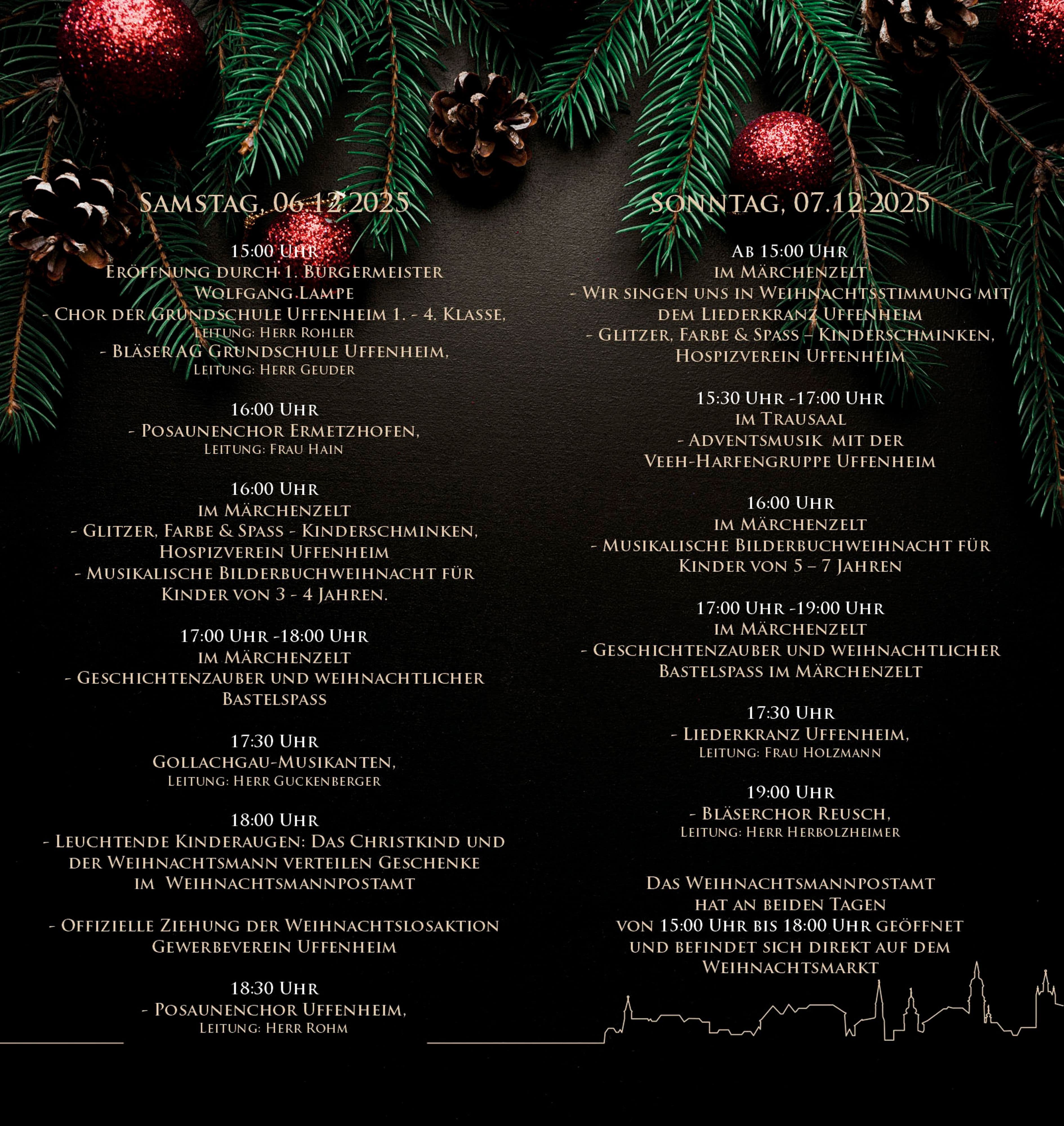 27 Buden, Kinderprogramm und feierliche Stele: Weihnachtsmarkt am 6. und 7. DezemberAm 6. und 7. Dezember 2025 lädt der traditionelle Uffenheimer Weihnachtsmarkt im Schlosspark mit 27 festlich geschmückten Buden, regionalen Spezialitäten und einem vielseitigen Programm für alle Altersgruppen zum Besuch ein. Musikalische Aufführungen, Kinderaktivitäten wie Märchenzelt und Kinderschminken sowie die Bescherung durch Christkind und Weihnachtsmann am Samstag sorgen für stimmungsvolle Unterhaltung. Am Sonntag steht die feierliche Einweihung einer neuen Stele am Pavillon auf dem Programm, je nach Wetterlage. Geöffnet ist der Markt jeweils von 15:00 bis 20:30 Uhr.