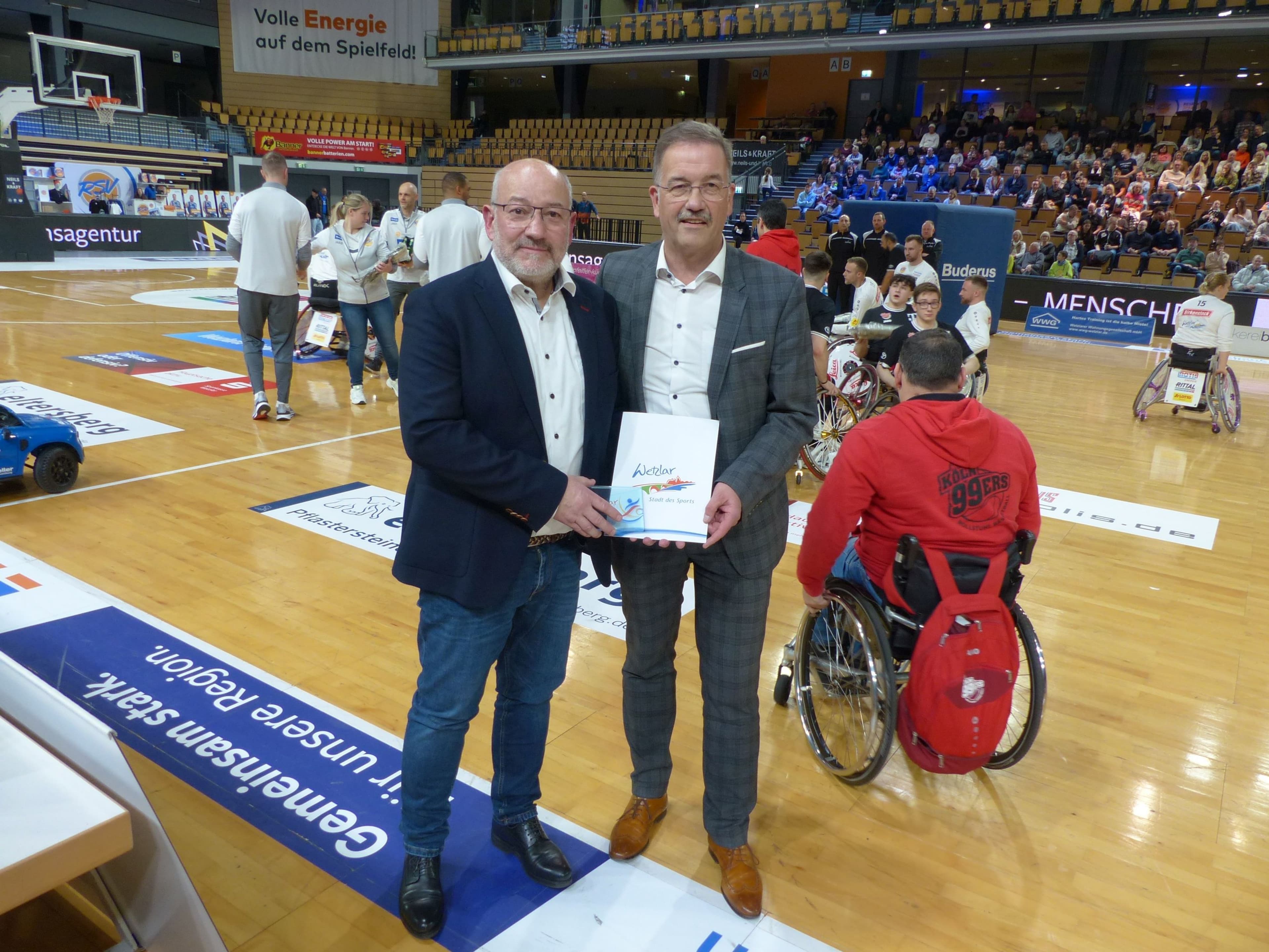 15.000 Euro Förderung für mobile Rollstuhl-Tribüne – Ehrung durch Oberbürgermeister WagnerDer Rollstuhl-Basketball-Verein Lahn-Dill wurde als „Botschafter des Inklusionssports“ ausgezeichnet, eine Ehrung, die vom Oberbürgermeister Wagner an Geschäftsführer Andreas Joneck übergeben wurde. Mit der Auszeichnung verbunden ist eine Förderung von 15.000 Euro zur Errichtung einer mobilen Rollstuhl-Tribüne für die Heimspiele. Der Titel würdigt das vorbildliche Engagement des Vereins im inklusiven Sport und gilt für ein Jahr. Am 21. November empfängt der Verein die RBC Köln 99ers in der Buderus-Arena, wobei das Spiel aufgrund der Ehrung besondere Beachtung erfährt.